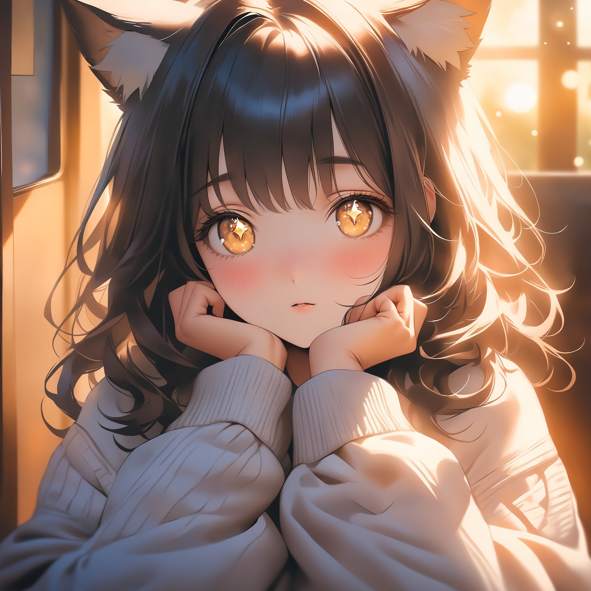 High quality, realistic anime style, a cute cat-eared girl tilting her head to the side with a curious and shy expression. She is wearing an oversized sweater with long sleeves covering her hands (moe-sode), peeking at the viewer with large sparkling eyes. Her fluffy ears are slightly drooping, looking incredibly soft. Soft bokeh background, golden hour lighting, warm and cozy atmosphere, masterpiece, sharp focus on her face, 8k.