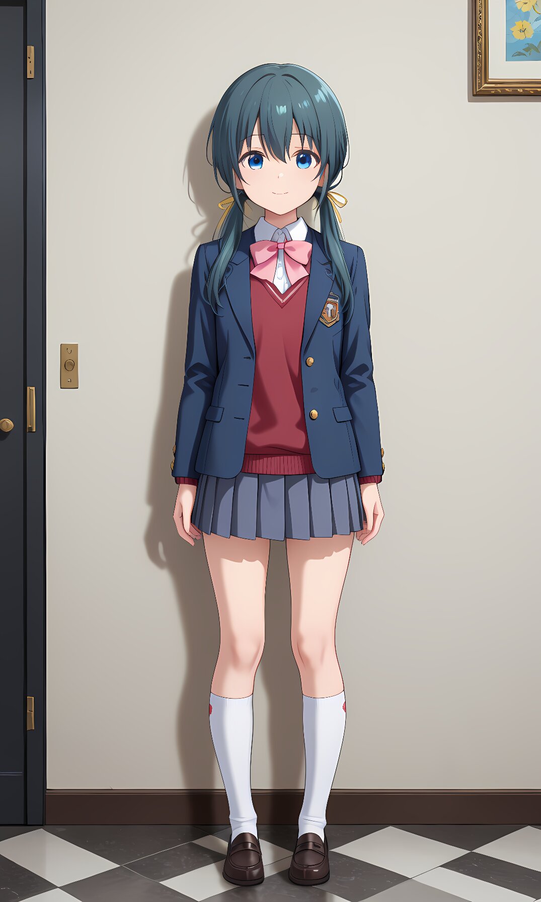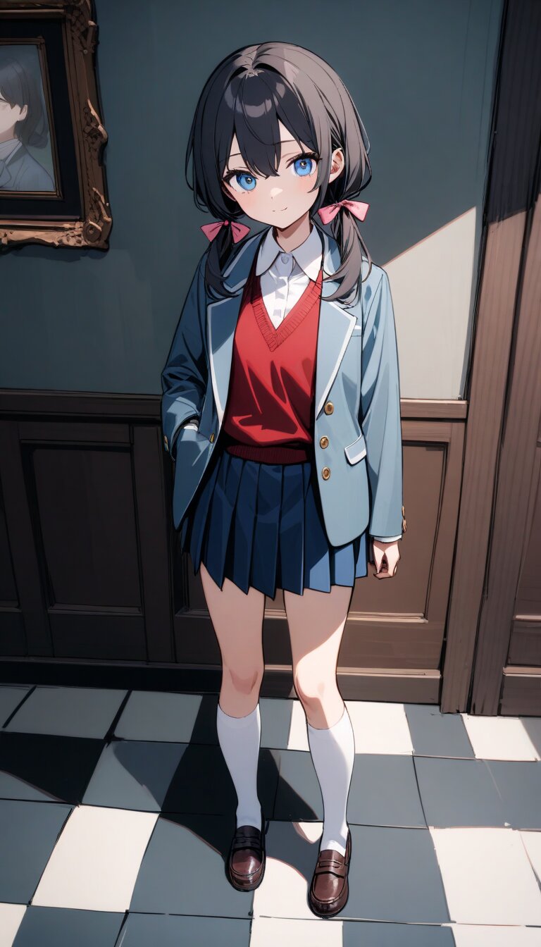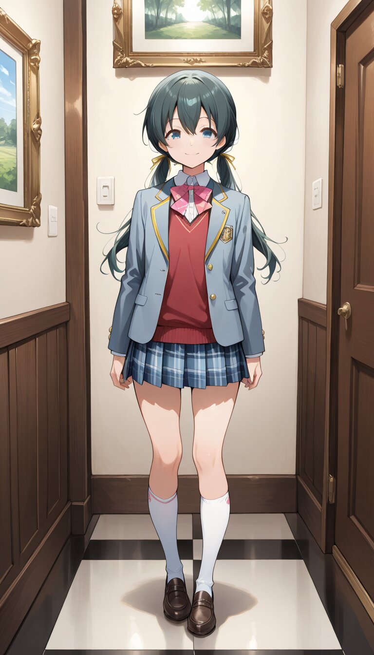 masterpiece,best quality,amazing quality,general, fine detail, official art, 1girl, cute face, The image shows a girl in a school uniform standing in a room with a floor, walls, a door, and frames attached to the wall. She is wearing a long, dark-colored dress with a white collar and a pink bow in her hair. Her eyes are closed and her expression is peaceful, as if she is in a moment of contemplation. 1girl, solo, long hair, dark green black hair, low twintail, twintail ribbons, yellow hair ribbon, hair between eyes, blue eyes, ((beautiful eyes)), (flat chest), school uniform, long sleeves, jacket, open jacket, buttons, blue gray jacket, blazer, red brown sweater vest, white shirt, collared shirt, skirt, pleated skirt, miniskirt, blue gray skirt, socks, white socks, kneehighs, loafers, looking at viewer, closed mouth, standing, full body, open clothes, indoors, light smile, picture frame, checkered floor,