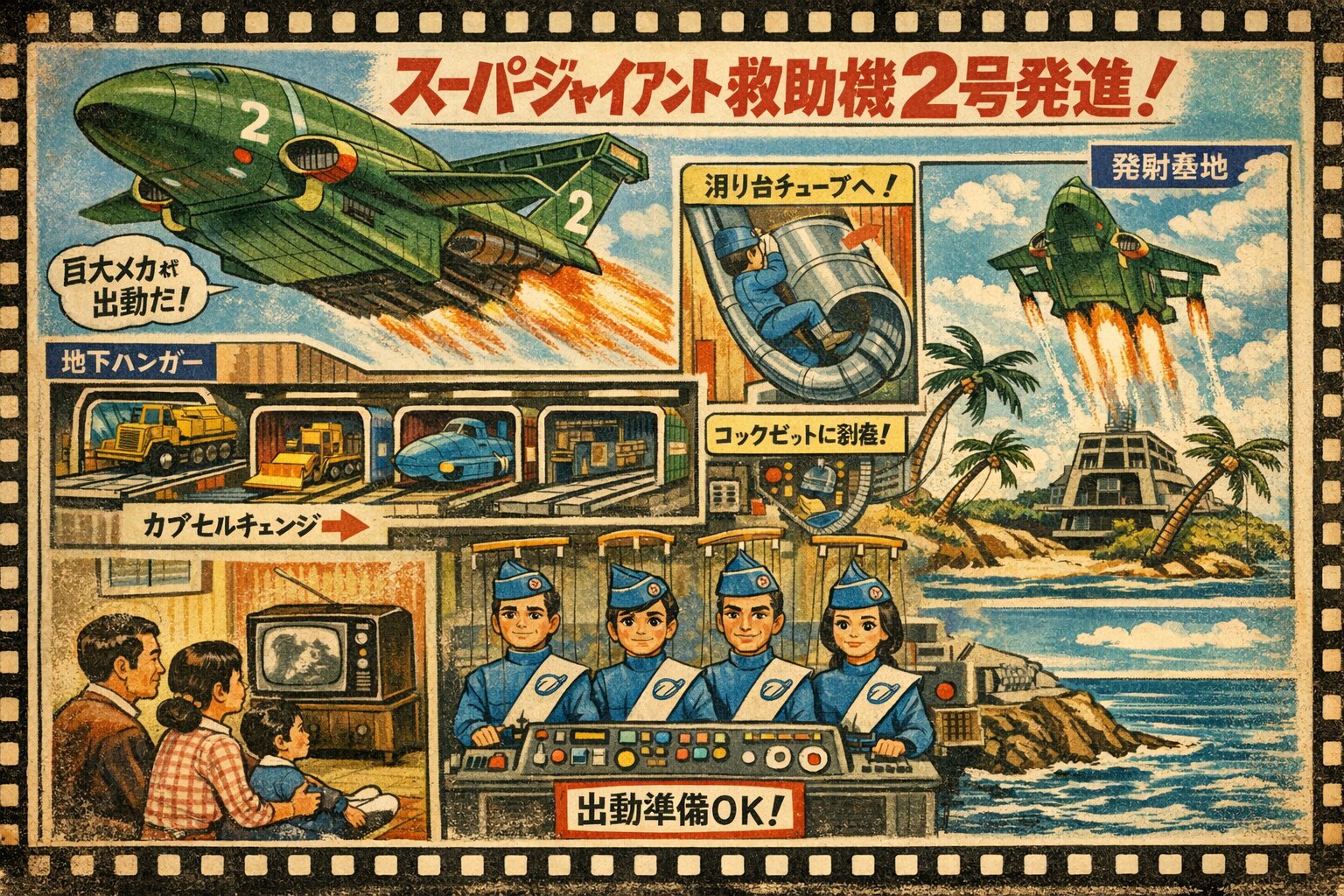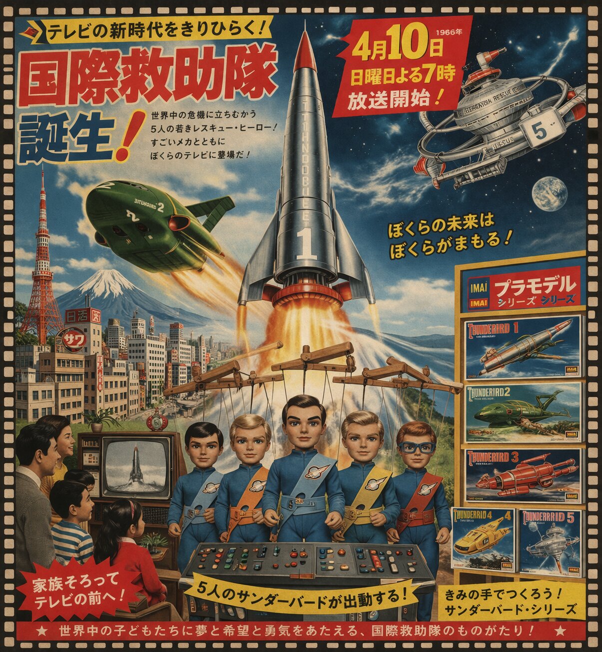A retro 1960s Japanese sci-fi illustration titled "The Birth of the International Rescue Team!". The composition is a dynamic montage celebrating the broadcast premiere on April 10, 1966. In the center, a silver rocket-shaped craft (Thunderbird 1 style) ignites its engines, flanked by a bulky green transport plane (Thunderbird 2 style) and a sleek space station in the upper corner. Below the crafts, five puppet-like heroes in blue uniforms and sashes stand heroically behind a futuristic control panel, with visible marionette strings and wooden controllers above them. On the left, a traditional Japanese cityscape with Tokyo Tower and Mount Fuji is visible, while a family sits in a vintage living room watching the scene on a small CRT television. On the right, a toy store shelf is packed with colorful "Plastic Model" kits of the rescue vehicles. The style is vintage multi-color lithograph print, featuring vibrant but slightly faded tones, a film-strip border, and bold Japanese typography.
