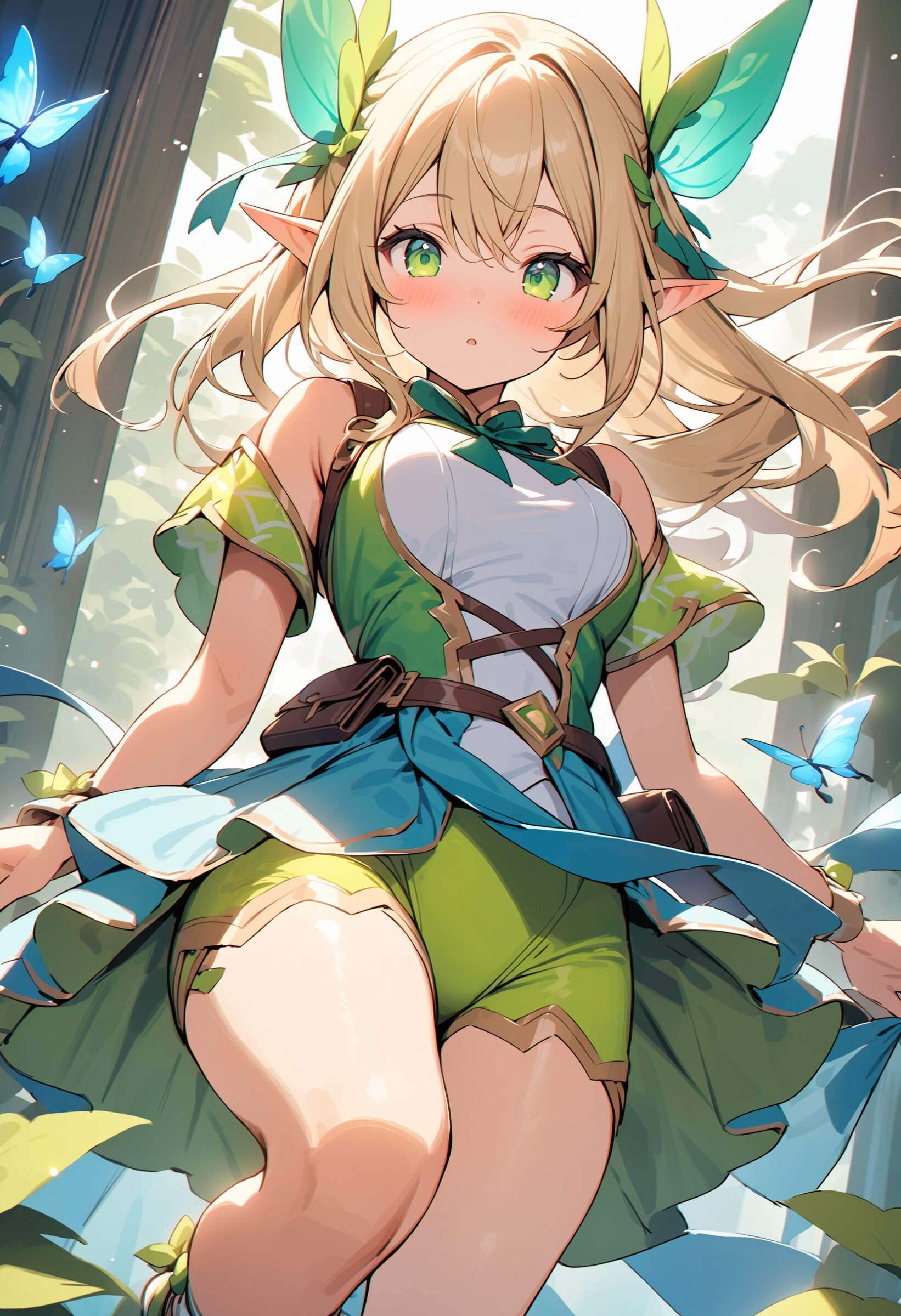 ((masterpiece)), ((best quality)), ((kawaii)), cute, (lovely), ((extremely detailed)), (beautiful), dynamic angle, a cute girl, 1girl, solo, ((elf)),beautiful blond hair, beautiful green eyes, ((beautiful eyes)), long hair, fantasy clothes,