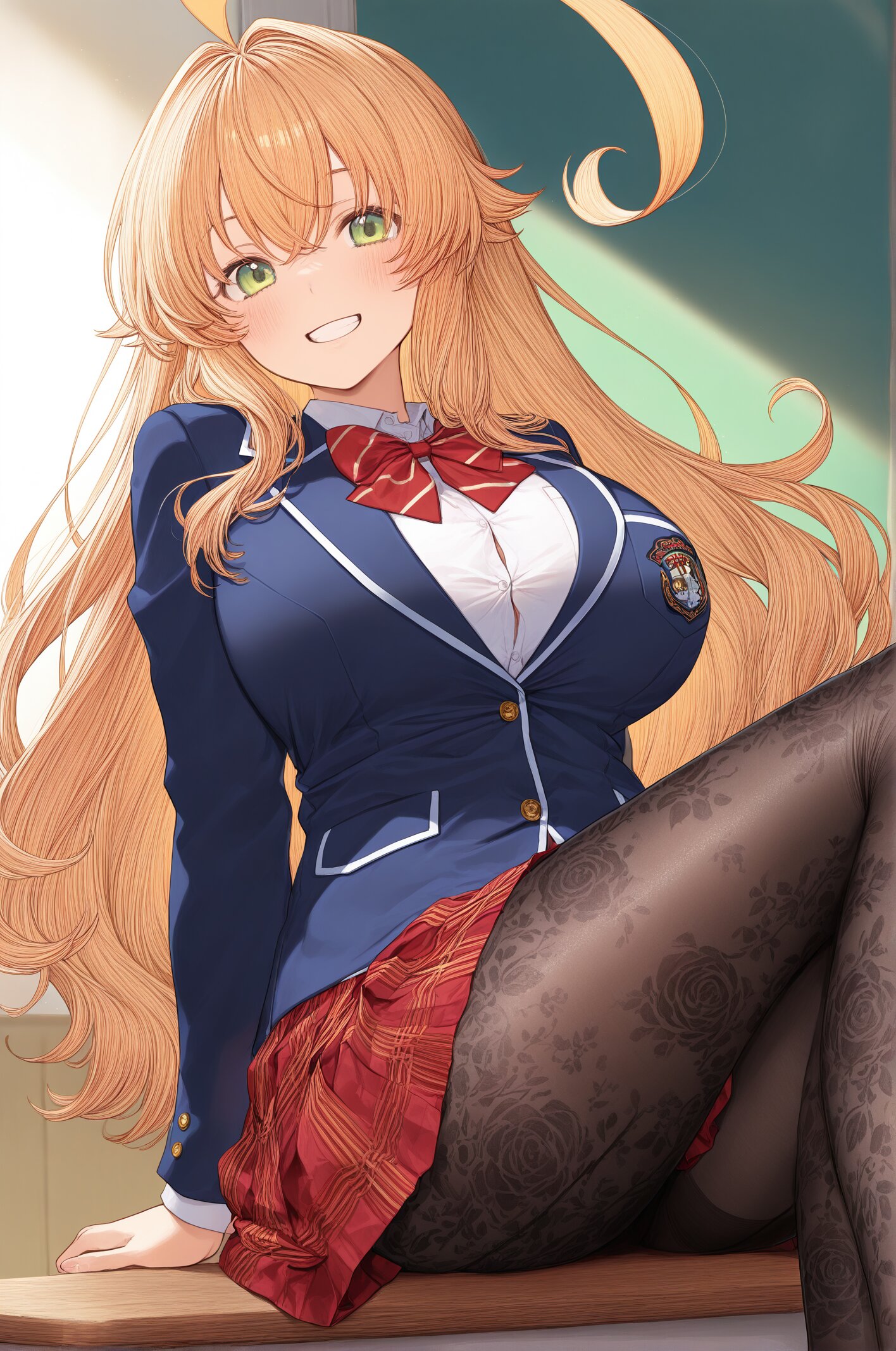 blazer uniform, japanese high school uniform, navy blazer, chest pocket, school emblem, sheer pantyhose, patterned tights, lace pattern, delicate floral design, decorated tights, ribbon details, bow accents, lace trim, semi-transparent, 20 denier, subtle sheen, smooth texture, skin-tight, fine fabric, red tartan skirt, pleated mini skirt, tartan pattern, red base, black and yellow lines, classic british plaid, even pleats, sharp pleats, structured skirt, clean silhouette, proper fit, (solo), (huge ahoge:1.8),larege breasts:0.5,(long blond hair),(green eyes),(grin) ,rim lighting, specular highlights,,masterpiece,best quality,very aesthetic, <lora:StS-Illustrious-Detail-Slider-v1.0:2.> <lora:sdxl-hairdetailer_02:2> <lora:tanlines_v1:0.8>