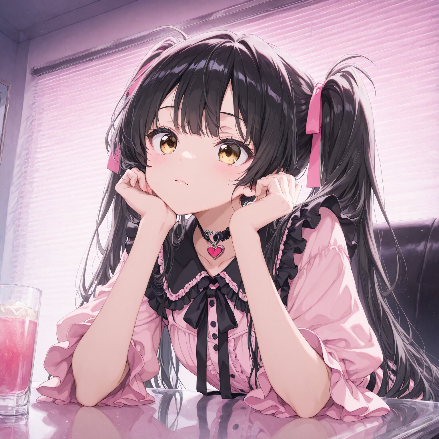 (1girl) Black hair, long hair, twin tails, golden eyes, hair tied with a pink ribbon pink dress, black frills, black ribbon, heart accessory, black frilly collar, heart choker Bar, glass on the table, elbows on the table, BREAK, (newest, anime, animation, anime screen capture, anime style:1.3) BREAK, (masterpiece, , vibrant, very aesthetic, highly detailed, best quality, 16k:1.3)