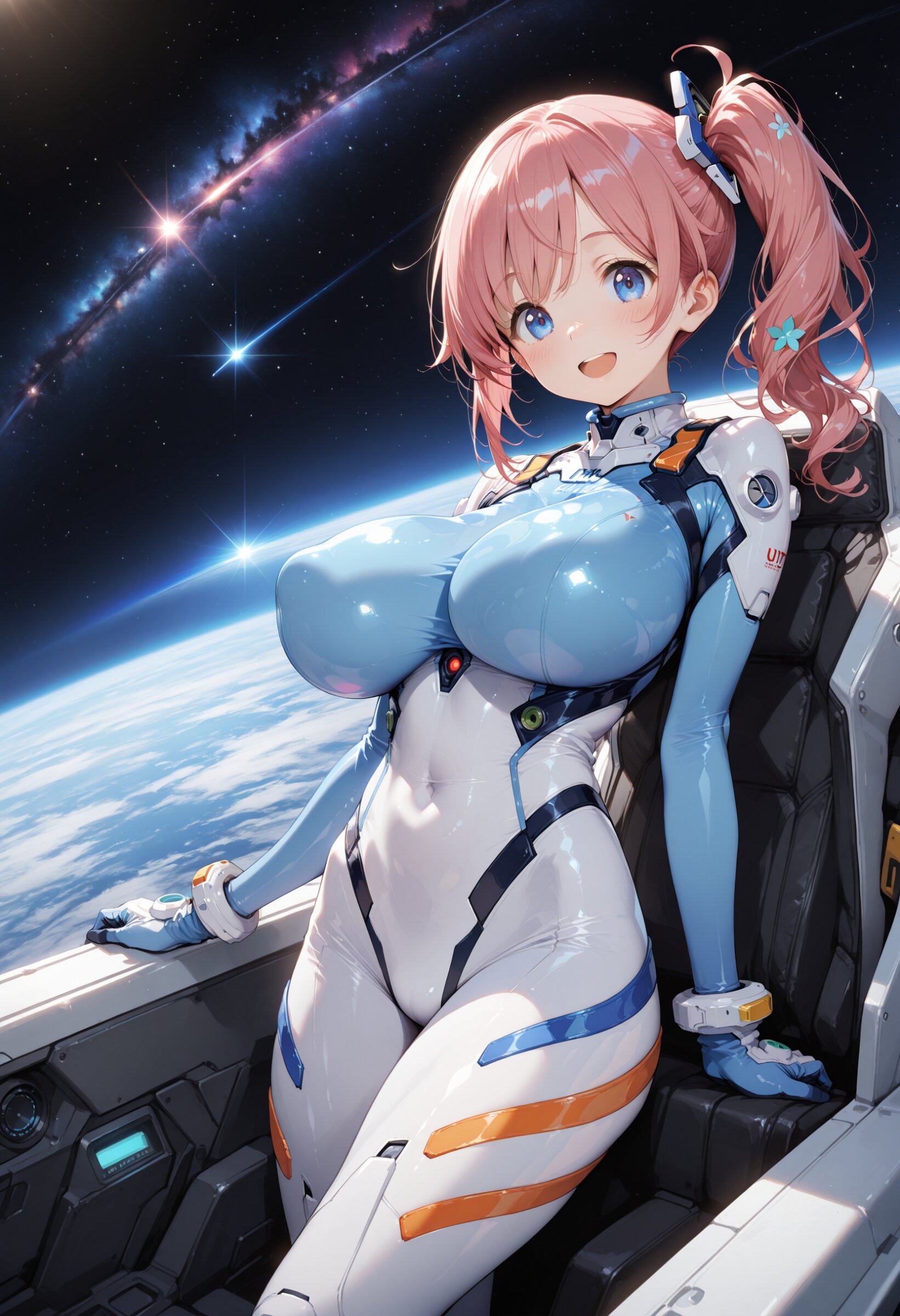 masterpiece, best quality, highres, ultra-detailed, extremely detailed, detailed, 1girl, loli, body suit, pilot suit, white bodysuit, purple bodysuit, skin tight, covered navel, gloves, pink hair, purple eyes, side ponytail, bangs, hair ornament, big breasts, impossible clothes, perky breasts, innocent expression, space landscape, ,