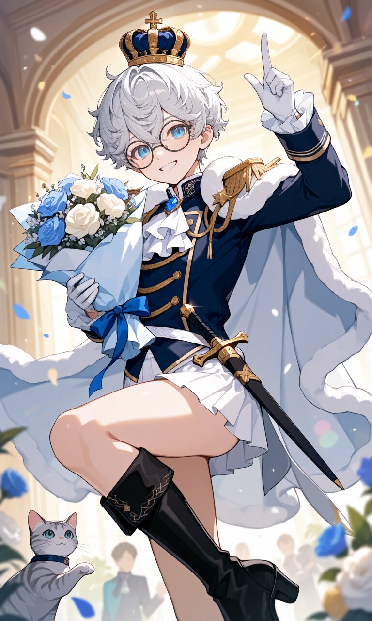 A 14-year-old boy with (white hair:1.5) styled in (short curly hair:1.4) and striking blue eyes behind (big round glasses:1.2) looks directly at the viewer with an intelligent, happy smile. He wears a (Navy luxurious Prince costume:1.5) complete with (White frilled jabot), epaulettes, and long sleeves, topped with a (luxurious White Cape:1.4). His outfit includes a (luxurious White mini skirt:1.5) that reveals bare thighs, (Black luxurious Boots:1.3), and (luxurious White gloves:1.2). A (dagger on waist:1.3) and (luxurious crown on head:1.3) complete his princely attire. He strikes a cute pose while (holding a bouquet in hand:1.8), surrounded by friends in a (luxury ball room) with (baroque architecture:1.2) and (Palace:1.2) details. The scene features lots of flowers, a cute silver tabby cat, and dreamy soft lighting with lens flare effects, creating a heartwarming birthday atmosphere with romantic academia vibes. His detailed face, skin, and clothing showcase masterpiece quality with insanely detailed 16k resolution.