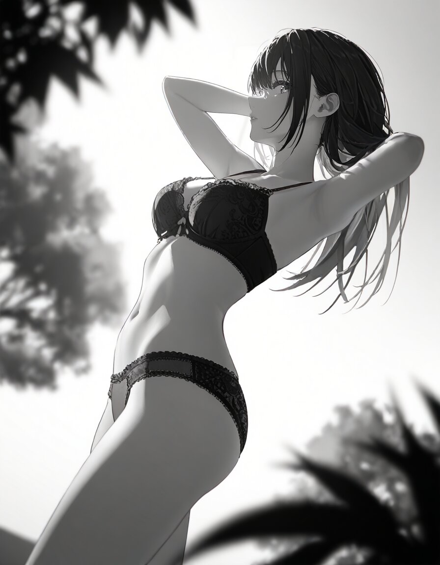 nsfw, masterpiece, best quality, amazing quality, very aesthetic, high resolution, ultra-detailed, absurdres, newest, scenery BREAK day, 1girl, solo, slender, monochrome, cowboy shot, from side, (from below:1.4), looking at viewer, sideways glance, arm behind head, black bra, black panties, lace-trimmed bra, lace-trimmed panties, lace trim, blurry, dark, moody lighting BREAK depth of field, volumetric lighting