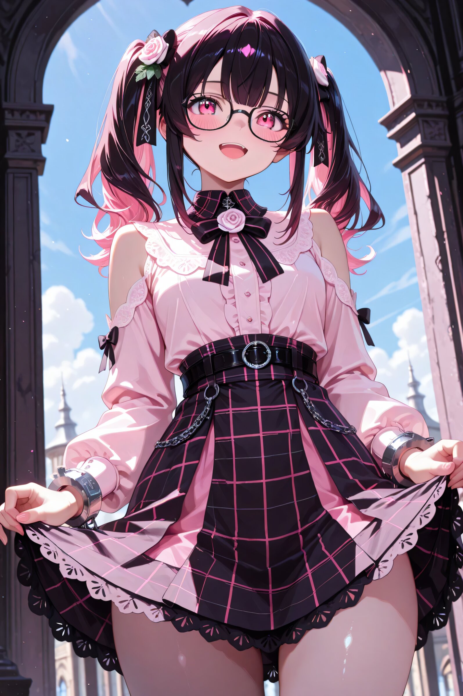 absurd, high definition, masterpiece, Highest Quality, great quality.cinematic angle.best eyes,1 girl, solo,"sera",cute face,open mouth,blush,healthy skin,dark pink eyes,black frame glasses,twin tails,black long hair with pastel pink inner color;white Dusty rose long-sleeve blouse with cascading ruffle panels along shoulders and front yoke, lace-trimmed cutout shoulders, and cuffed sleeves finished with pintuck detailing; detachable black grosgrain ribbon bow at collar; high-waisted black-and-white plaid tiered mini skirt, a built-in black belt featuring a silver O-ring buckle, and flounced hem panels; blue sky.smile,skirt lift