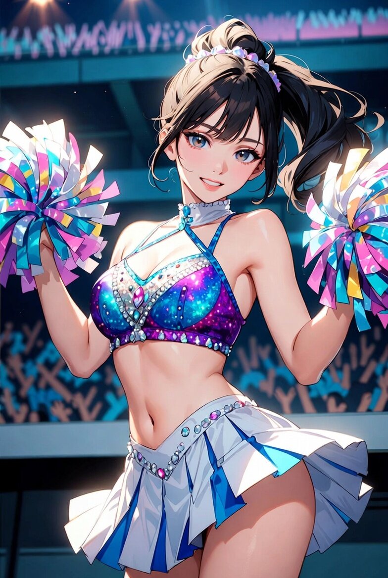 日本人女性24歳のチアリーダーのデジタルイラスト。きらりと輝く宝石をモチーフにしたユニフォームを着ている。ポンポンを両手にもっている。背景はスタジアム。みんなを元気づけるポーズ。