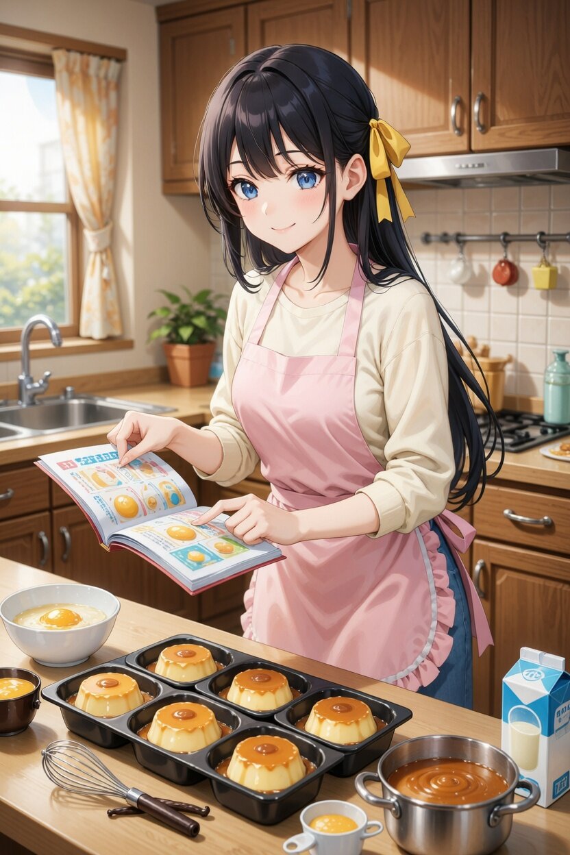 日本人女性24歳が、自宅のキッチンでプリン作り。レシピ本を見ながら4人分作っている。カジュアルな服装をして、エプロンをつけている。髪は黄色のリボンで結んでいる。
