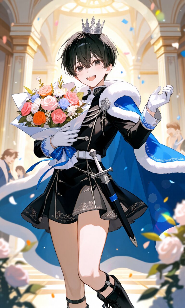 A young male character with short black hair and beautiful, expressive black eyes stands in a luxurious palace ballroom, dressed in a (Black luxurious Prince costume:1.5) with long sleeves, a (luxurious Blue Cape:1.4), and a (luxurious Black mini skirt:1.5) that reveals his bare thighs. He wears (Black luxurious Boots:1.3) and a (luxurious crown on head:1.3), with a (dagger on waist:1.3) and (luxurious White gloves:1.2). His face is detailed and cute, with a happy, cheerful expression and a little smile as he strikes an idol pose, (holding a bouquet in hand:1.8) filled with vibrant flowers. The scene is set at a birthday celebration, creating a heartwarming atmosphere as he is (surrounded by friends:1.8). The background features a (Palace:1.2) with baroque architecture, lots of flowers, and a dreamy, light atmosphere enhanced by soft lighting, bloom effects, and lens flare abuse. The style is romantic academia meets classic academia, with insanely detailed textures in the clothes, skin, and hair, making it a masterpiece of best quality at 16k resolution.