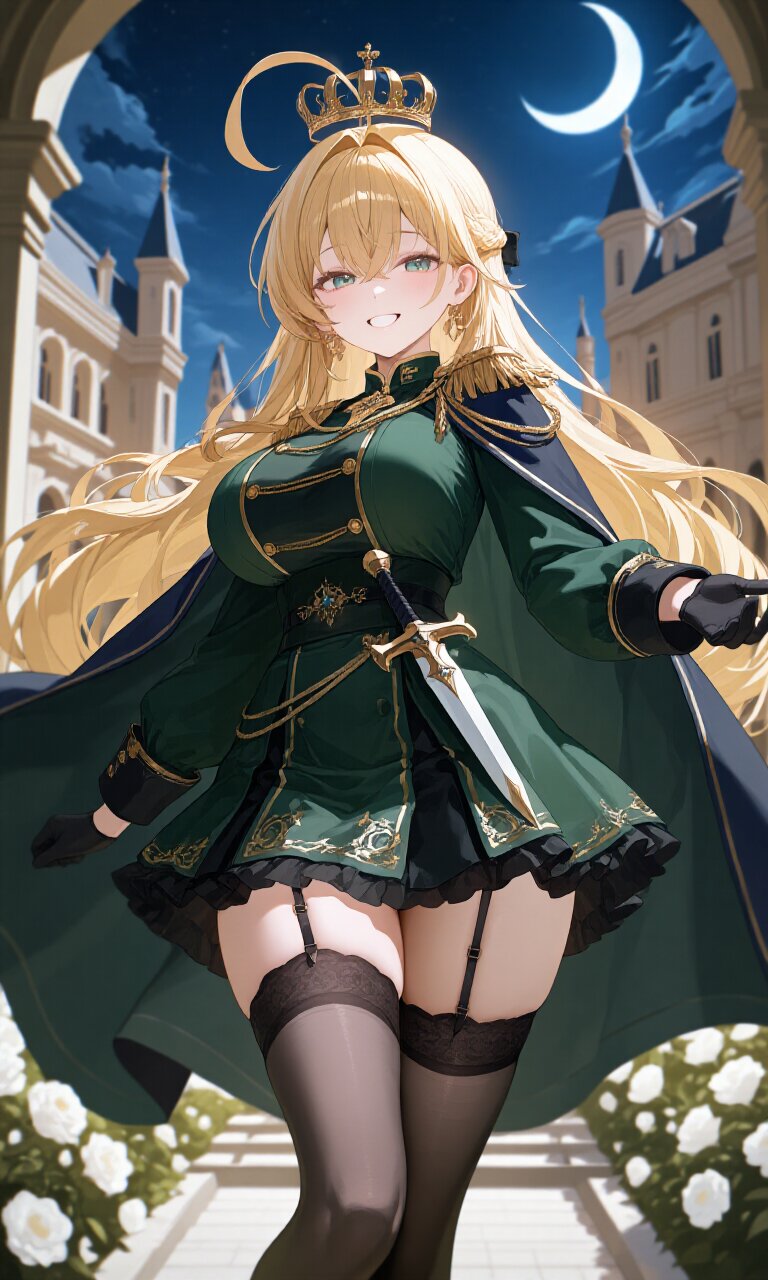 1girl, 18 years old, with long blond hair styled in a prominent (huge ahoge:1.5) and double-parted bangs framing her delicate face. She has (large breasts and hips:0.5), a cute expression with a cheerful grin, and wears an elaborate (Dark Green luxurious Prince costume:1.6) with long sleeves, accented by a (luxurious Navy Cape:1.3) flowing dramatically behind her. Her lower attire consists of a (luxurious Dark Green mini skirt with gold embroidery:1.4), paired with (Black sheer thighhighs:1.3) secured by lace garter belts. She accessorizes with (luxurious Black gloves:1.3) and a (dagger on waist:1.3), while a (luxurious crown on head:1.4) completes her regal look. The background features a grand palace with Romanesque architecture, surrounded by blooming flowers under a starry night sky with a crescent moon. The atmosphere blends romantic academia and classic elegance, with soft lighting enhancing the dreamy, fairytale-like setting. The art style is photorealistic, insanely detailed (16k masterpiece quality), capturing every intricate fold of fabric, strand of hair, and architectural flourish with lifelike precision. Her pose is dynamic yet graceful, radiating confidence and charm befitting a "Prince Charming" archetype.
