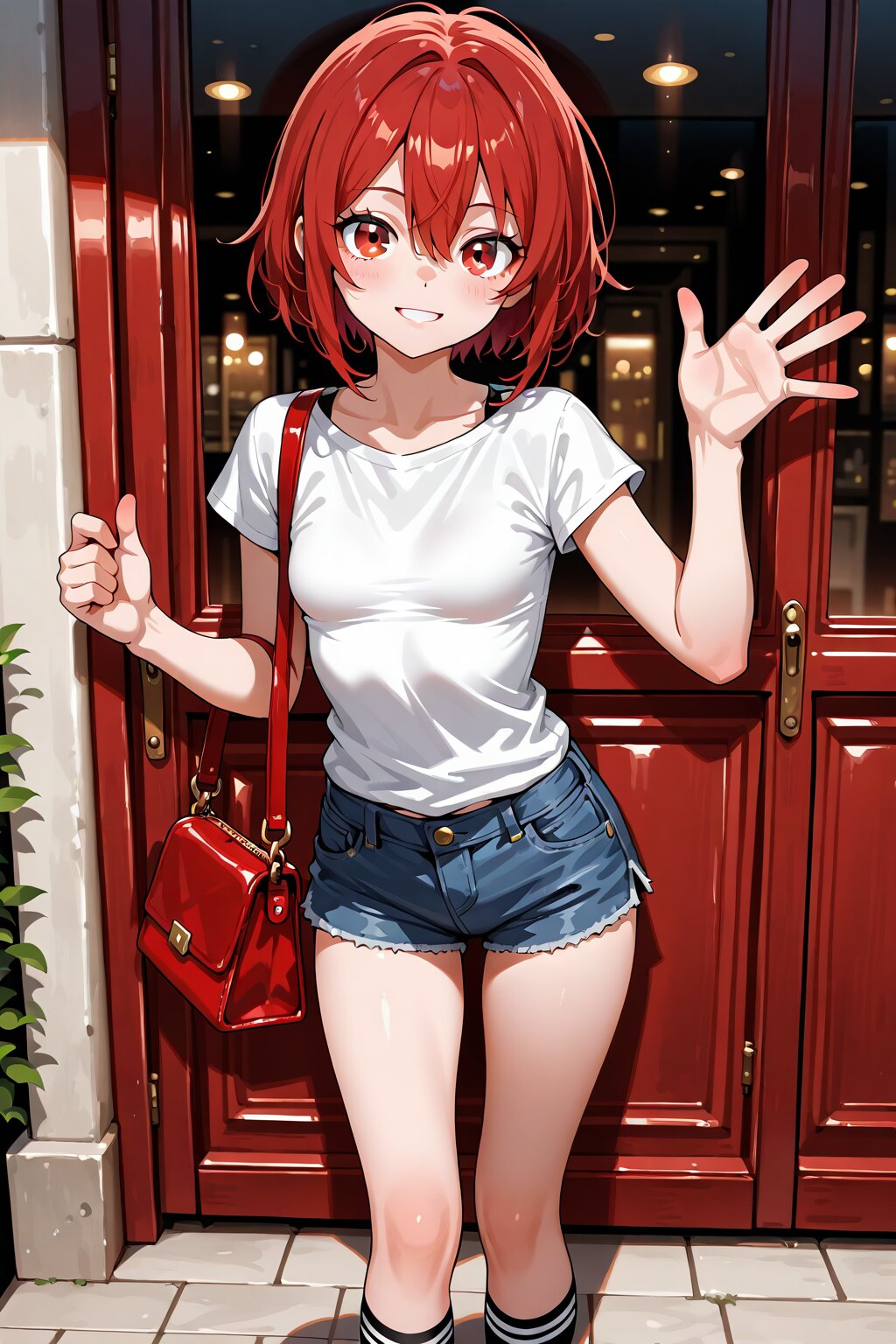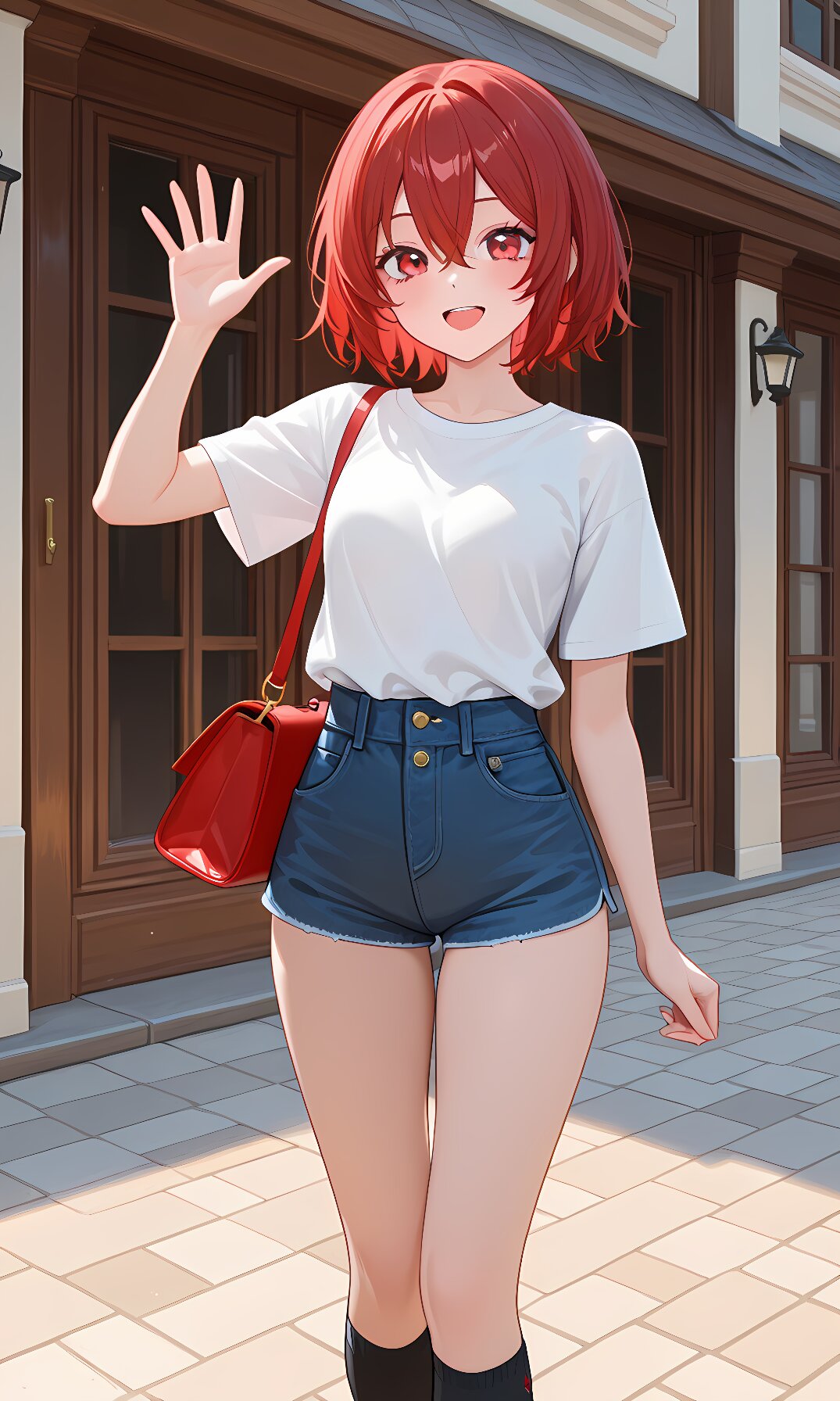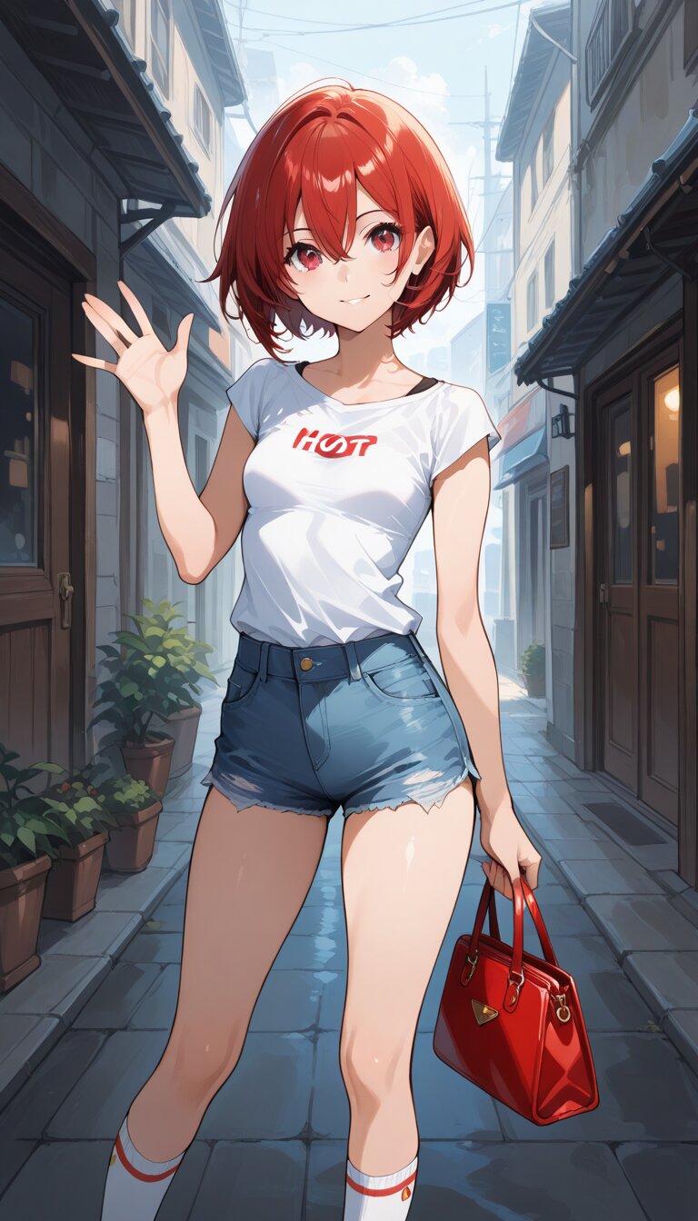 masterpiece,best quality,amazing quality,general, fine detail, official art, 1girl, cute face, the girl with red hair is holding up a red purse and holding her thumb up, 1girl, solo, red hair, short hair, hair between eyes, red eyes, (beautiful eyes), small breasts, (hot pants, short pants), bag, shorts, socks, waving, Perfect Hands,