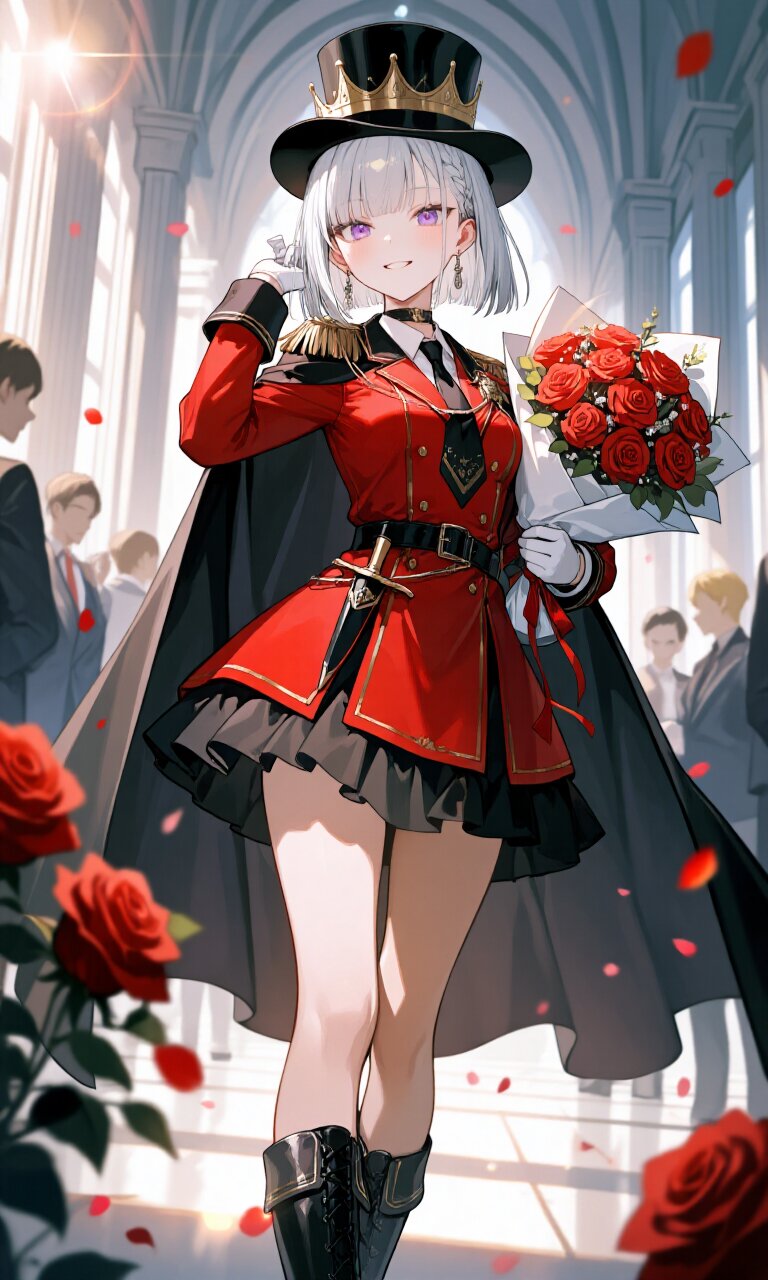 A 15-year-old girl with short, straight white hair and striking purple eyes stands in a luxurious palace ballroom, dressed as Prince Charming. She wears a (Black top hat:1.5) with a (luxurious crown:1.3) pinned to it, along with a choker and dangling earrings. Her (Red luxurious Prince costume:1.5) features long sleeves, a black necktie, and a waistbelt over a (luxurious Black mini skirt:1.3). A (luxurious Black Cape:1.4) flows dramatically from her shoulders, and she wears (Black luxurious Boots:1.3) with (luxurious White gloves:1.2). A (dagger on waist:1.3) completes her princely look. She holds a (holding a bouquet in hand:1.8) of roses while striking a cute pose, looking directly at the viewer with a happy expression and parted lips. The scene takes place in a (Palace:1.2) with (postmodern architecture:1.2), decorated with lots of Roses and (surrounded by friends:1.8) celebrating her birthday. The atmosphere is heartwarming, romantic academia with soft lighting, bloom effects, and lens flare abuse creating a dreamy, light atmosphere. The image is rendered with insanely detailed skin, hair, clothes, and face in a masterpiece-quality 16k resolution.