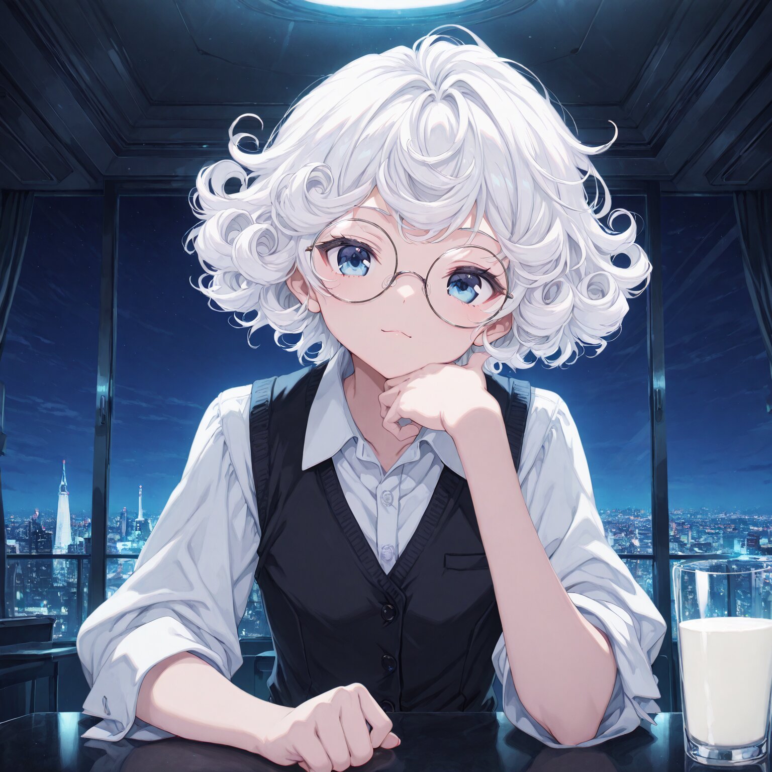 1boy (big round glasses:1.2), (white hair:1.5), (short curly hair:1.4), (blue eyes:1), Dress shirt, vest, gentleman Glass, glass of milk, hand on chin Bar, glass on the table, elbows on the table, detailed night club room, LED interior, colored light, dim lighting BREAK, (newest, anime, animation, anime screen capture, anime style:1.3) BREAK, (masterpiece, , vibrant, very aesthetic, highly detailed, best quality, 16k:1.3)