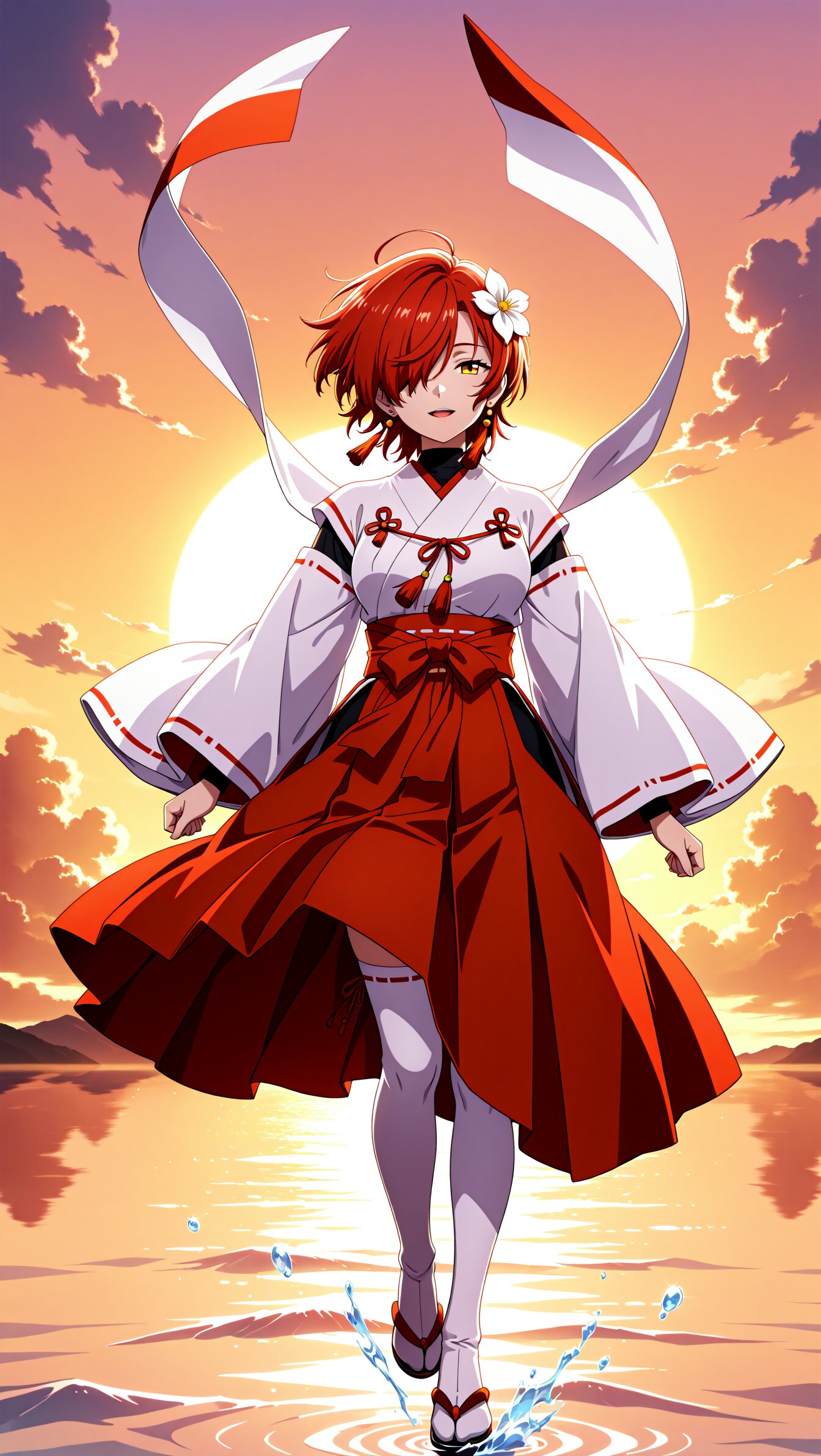 <lora:MeMax6-noob-vpred:1>,memaxl6_a,memaxl6_b,memaxl6_c,memaxl6_d,memaxl6_e, (10's anime style:1.2), Full HD,32K, 1girl, solo, full body, straight-on:1.2, standing midair, floating:1.6, (goddess:1.2), (floating hair:1.6, wind:1.8, showing forehead), looking at viewer, light smile, half-closed eyes, open mouth, (teenage :1.3), (medium breast), (slender):1.2, (tareme), beautiful hair, shiny hair, crimson hair, hair over one eye, (wolf cut, short hair):1.1, ahoge, dark-yellow eyes, (Celestial Maiden:2.0), (japanese clothes, clothing cutout, flower hair ornament, red-white miko:1.2, long sleeves, medium skirt, red-tassel earrings, white thighhighs, tabi, black undershirt), (red hagoromo):1.6, (water background, sunset, sunrise, wave, water drop:2.0, backlighting:1.2, high contrast:1.2, ), masterpiece, best quality, super fine illustration, very aesthetic, newest, hyper detailed, intricate, beautiful, aesthetic, highly decorative, HDR, yume kawaii, ,anime screencap,anime,no gradients, 2D flat design, bold outlines,