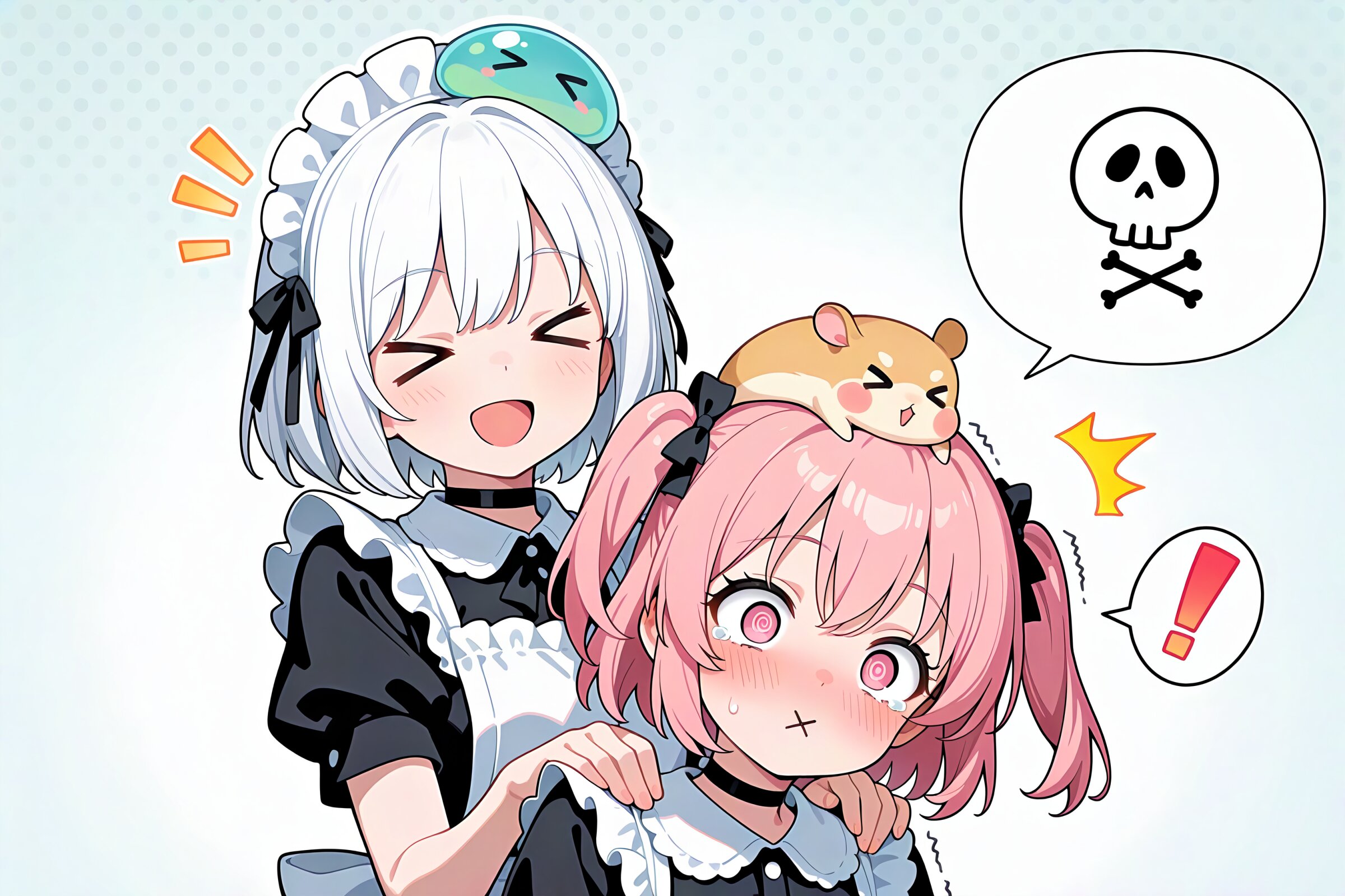 2 little girls, upper body,shoulder massage, masterpiece, best quality, amazing quality, very aesthetic, white hair, short hair, > <, open mouth, smile, cheerful, +++, notice lines, choker, maid outfit, slime on her head, > <, exclamation mark patterned background, BREAK 2 little girls, upper body,shoulder massage, masterpiece, best quality, amazing quality, very aesthetic, pink hair, twintails, pink eyes, @_@, (:x:1.2), tearful, surprised, confused, blush, trembling, constricted pupils, ^^^, spoken exclamation mark, spoken skull, choker, maid outfit, hamsters on her head, > <, smile, chestnut mouth, exclamation mark patterned background,