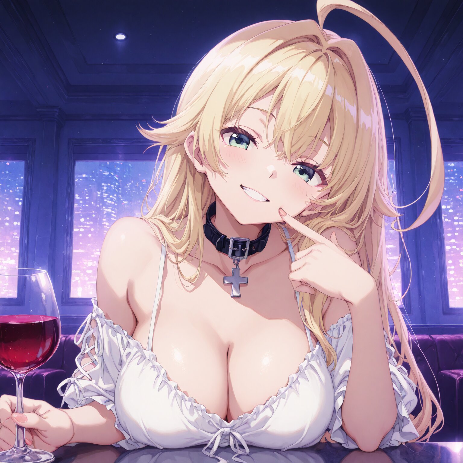 (1girl) (long blond hair),(huge ahoge:1.5),(large breasts and hips).(collar:1.3), Open neckline, cleavage, bare shoulders, cross-laced sleeves, white clothing Smiling, mischievous grin, wine glass Bar, glass on the table, elbows on the table, detailed night club room, LED interior, colored light, dim lighting BREAK, (newest, anime, animation, anime screen capture, anime style:1.3) BREAK, (masterpiece, , vibrant, very aesthetic, highly detailed, best quality, 16k:1.3)