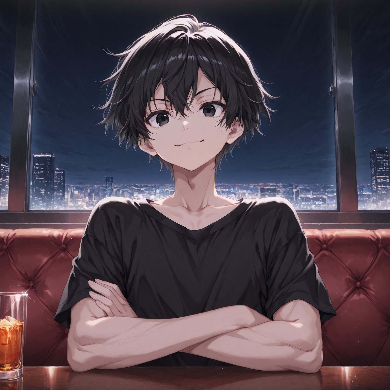 (1boy, male focus), sharp nose, facial muscle, adam’s apple, larynx, flat chest, large pectorals muscle, small arms muscle, male face, male eyes ((short hair, Black hair, Black eyes)), Black shirt, little smile, expression eyes, beautiful eyes, Difficult expression, arms crossed, troubled Black t-shirt Bar, glass on the table, detailed night club room, BREAK, (newest, anime, animation, anime screen capture, anime style:1.3) BREAK, (masterpiece, , vibrant, very aesthetic, highly detailed, best quality, 16k:1.3)