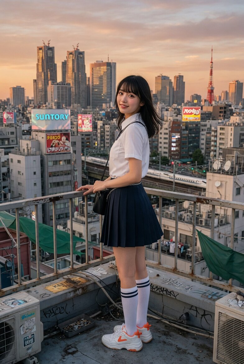 リアルなフォト。, BREAK Japanese woman, 23yo, (cute:1.1), (pretty:1.1), hyper detailed face, hyper detailed eye, beautiful eye, medium hair,bangs, thin,tall, perfect anatomy, Pleated Skirts, High Socks, Sneakers, hyper detailed background, city background,hyper detailed, standing, on roof top.