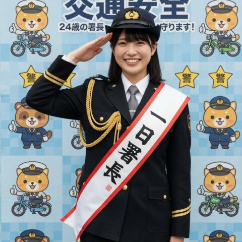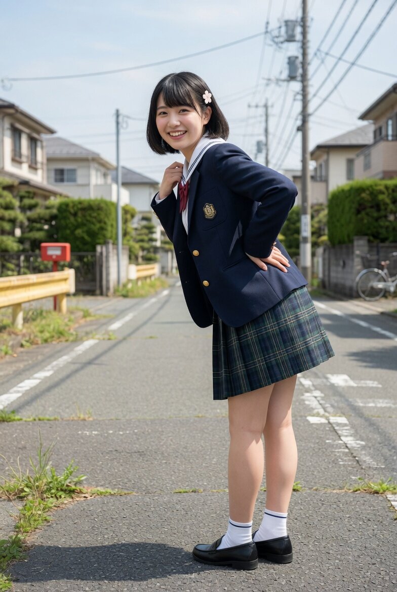 日本人女性18歳のリアルなフォト。ポーズを付けて、カメラの方を振り返って明るく笑っている。愛らしい表情。高校生の制服を着ている。ブレザーの上着とチェック柄のスカート。明るい自然光。郊外の道路。短いソックスを履いている。背中側から地面近い位置からの構図。