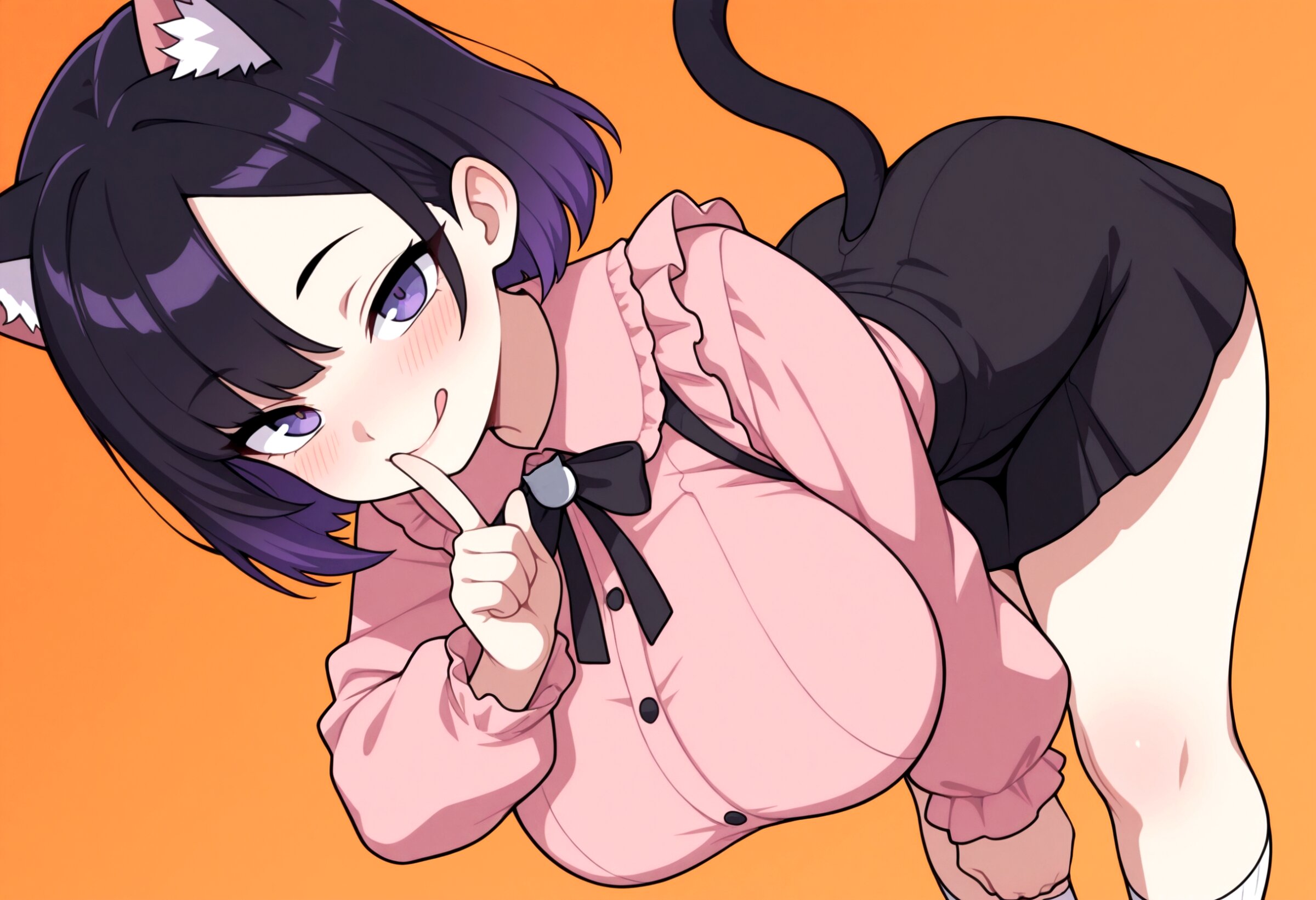1girl, solo, breasts, looking at viewer, short hair, shirt, large breasts, skirt, long sleeves, animal ears, purple eyes, tail, purple hair, tongue, black skirt, cat ears, tongue out, cat tail, bent over, pink shirt, orange background