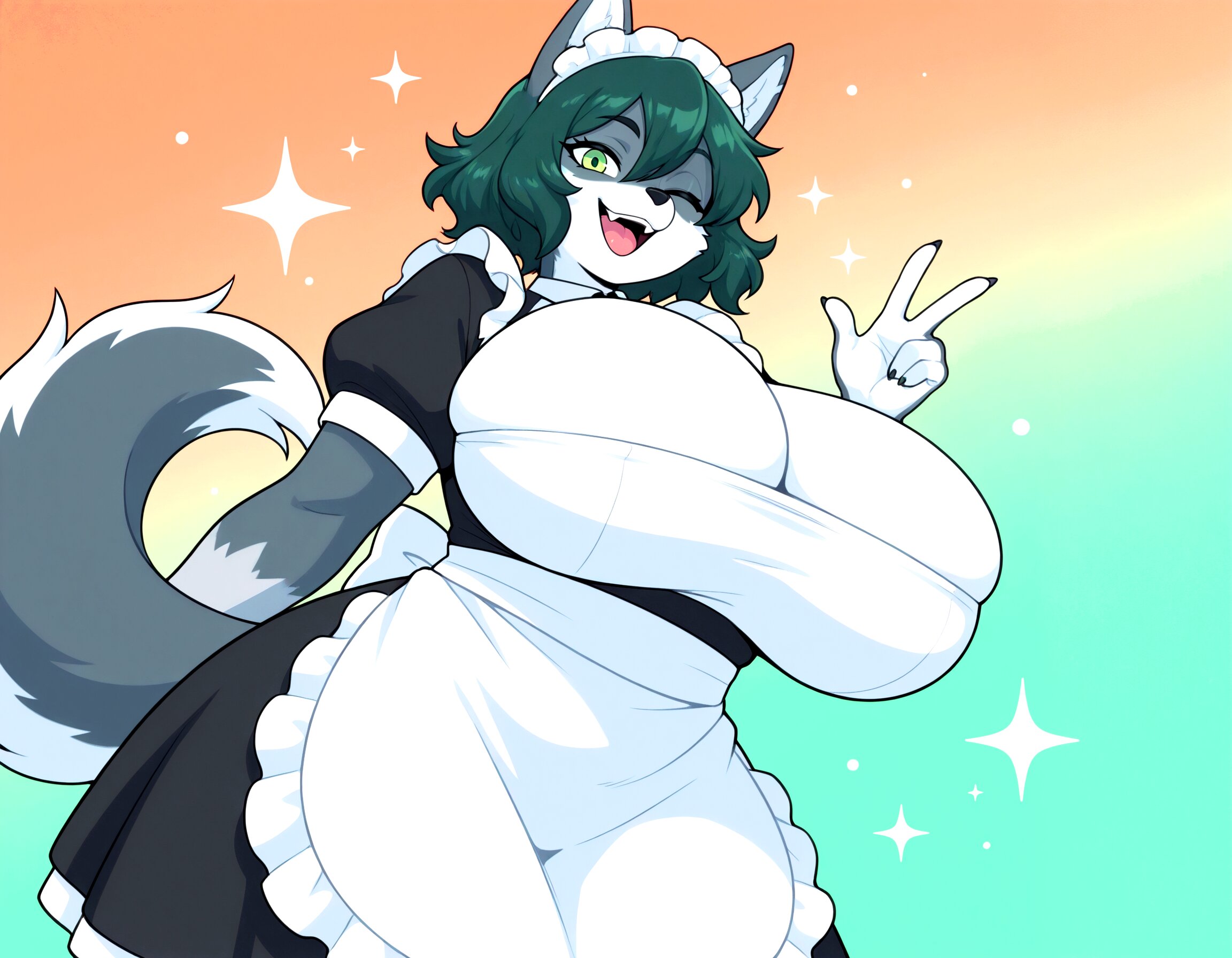 1girl, solo, breasts, looking at viewer, animal ears, cleavage, green eyes, tail, braid, maid, maid headdress, furry, furry female, snout