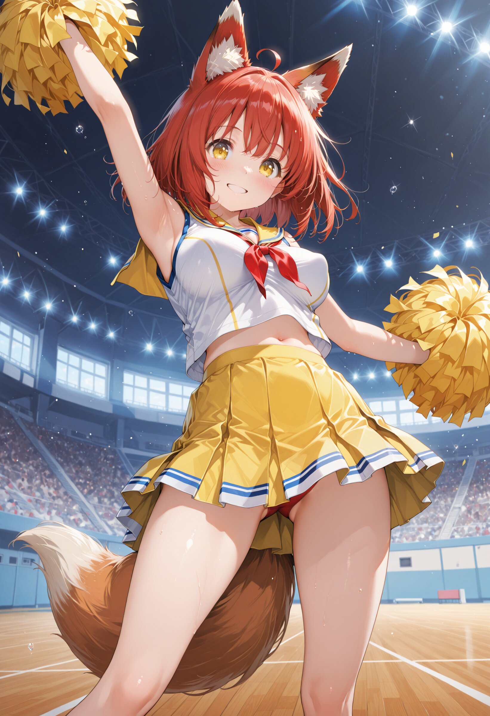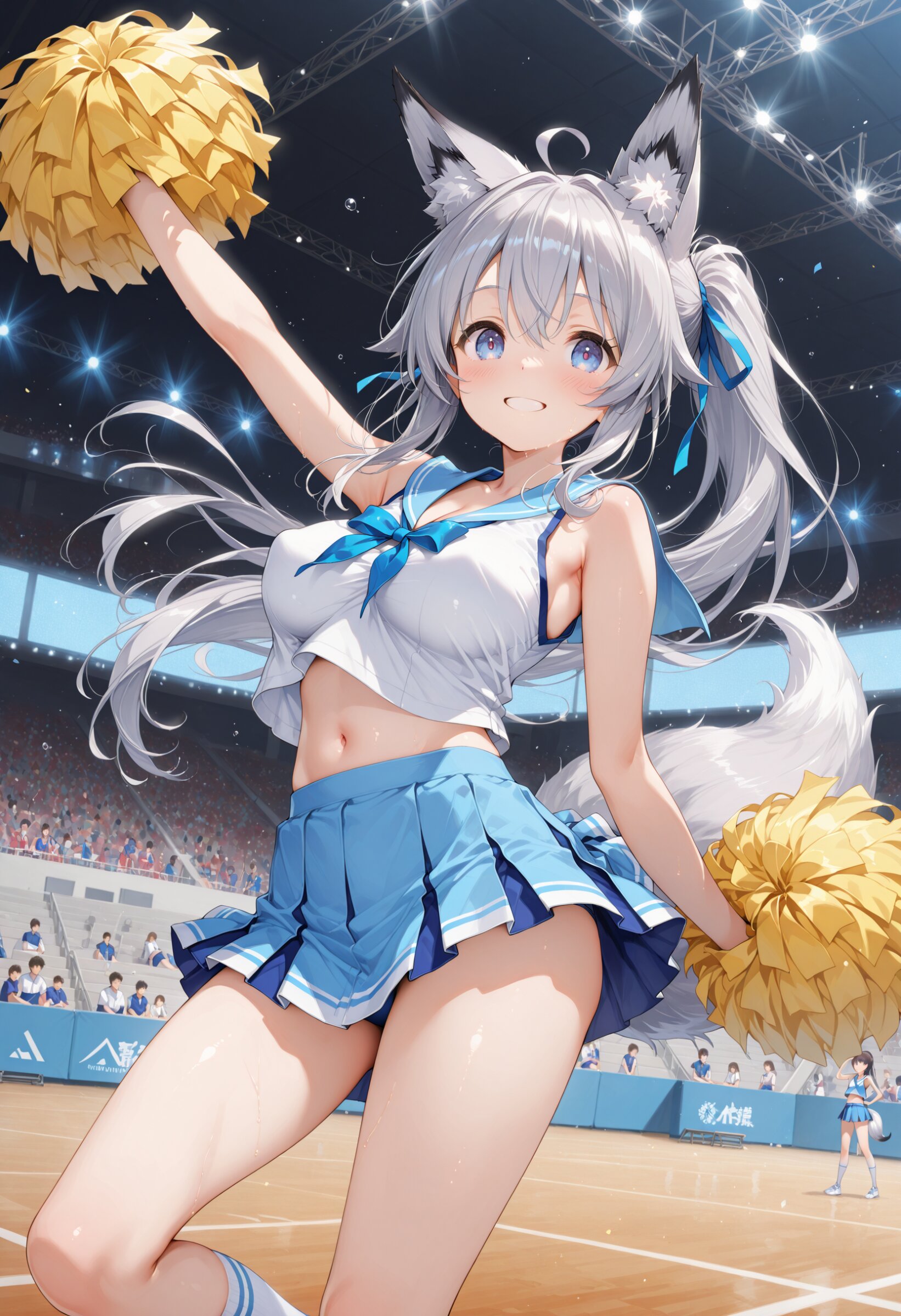 masterpiece, best quality, amazing quality, general, fine detail, official art, 1girl, loli, petite, beautiful hair, beautiful eyes, cheerleader, fox ears, fox tail, silver hair, light blue sailor collar, light blue miniskirt, sleeveless, cleavage between sailor collar, midriff peek, beautiful legs, big breasts, (perky breasts:1.2), school gym, innocent expression, smile, dance, dynamic action, Flexible chest that adapts to her movements, leaning back , from below, on stage, school ground,