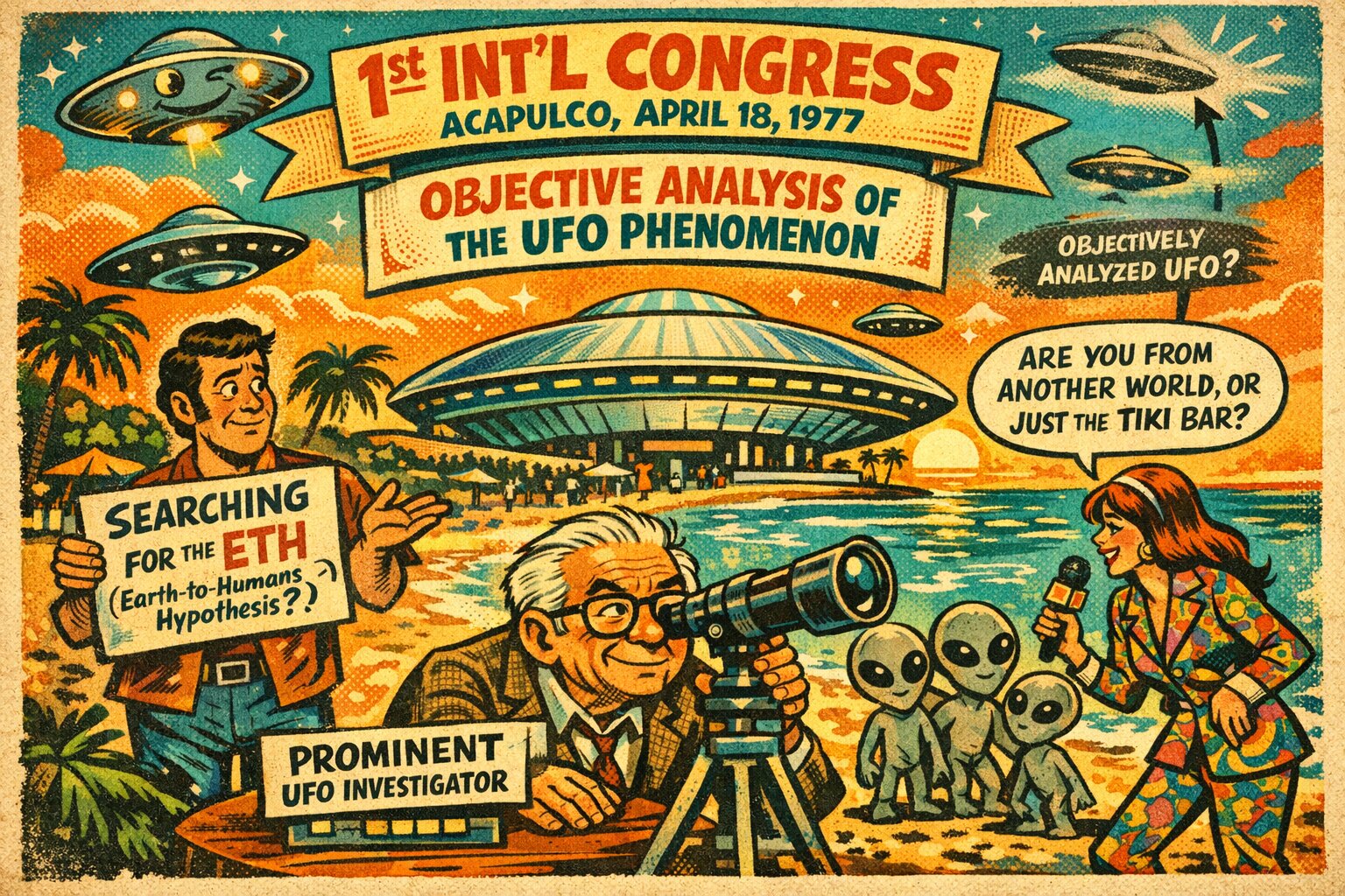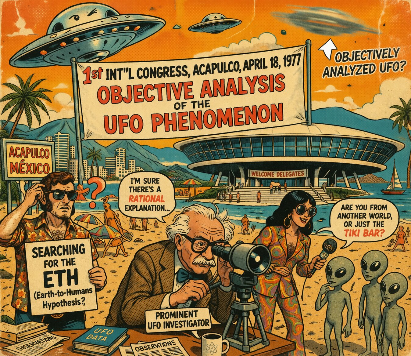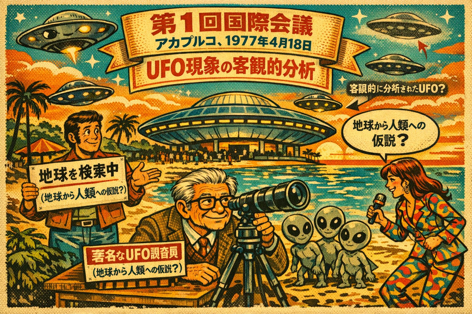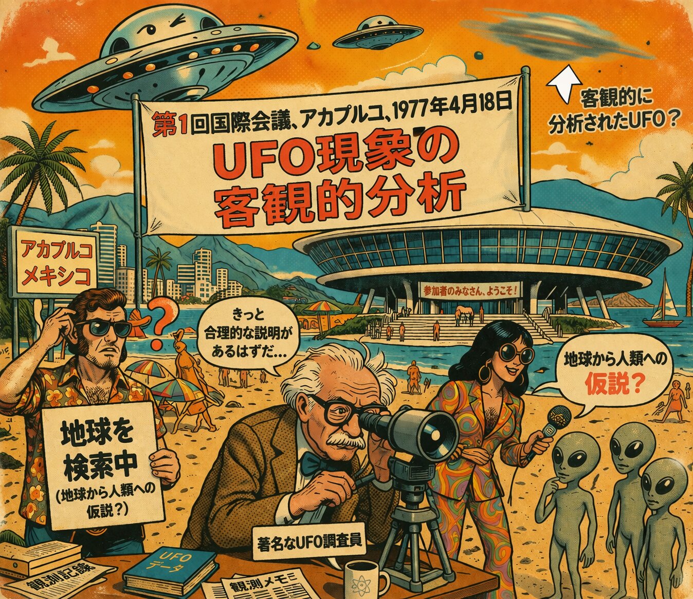 A retro-style comic illustration depicting the "UFO現象の客観的分析に関する第1回国際会議" in Acapulco, April 18, 1977. Setting: A sunny Mexican beach in Acapulco with a futuristic, saucer-shaped convention center in the background. The sky is bright orange and teal with a vintage 1970s color palette. Characters & Details: Center: A large banner reads "第1回国際会議、アカプルコ、1977年4月18日」および「UFO現象の客観的分析」" Bottom Center: An elderly scientist with glasses (resembling a generic 1970s professor) looking through a telescope, with a label "著名なUFO調査員" A speech bubble says, "きっと合理的な説明があるはずだ..." Left: A confused man with 70s sideburns holding a sign that says "SEARCHING FOR THE ETH (地球から人類への仮説?)." Right: A woman in a psychedelic 70s patterned suit holding a microphone, interviewing a group of small, curious-looking grey aliens on the sand. Her speech bubble asks, "地球から人類への仮説?" Sky: Several UFOs are visible; one is winking at the camera, and another is blurry with an arrow pointing to it labeled "客観的に分析されたUFO?" Art Style: 1970s magazine cartoon style, reminiscent of Mad Magazine or vintage travel posters, with halftone dots, slightly faded textures, and light paper grain. No real-life personal names included. When an anime that depicts dreams shifts to the production side, it loses its magic