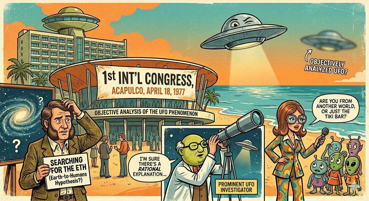 1970年代後半、世界各地でUFO現象への関心が高まり、民間研究者や一部の政治家の間で国際的な情報交換の必要性が指摘されていた。こうした流れの中で、1977年4月18日から23日にかけて、メキシコ・アカプルコのコンベンションセンターにおいて、**「第1回国際UFO現象会議(First International Congress on the UFO Phenomenon)」**が開催された。