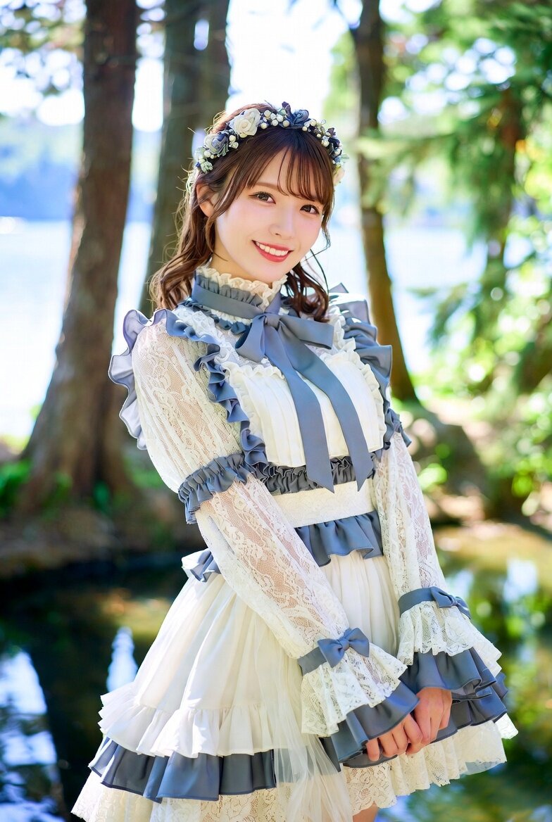 日本人女性23歳のリアルな写真。プロのカメラマンによる撮影。グレーイッシュブルーをアクセントカラーにしたロリータの衣裳を身につけている。森と湖の前で撮影。表情は笑顔。