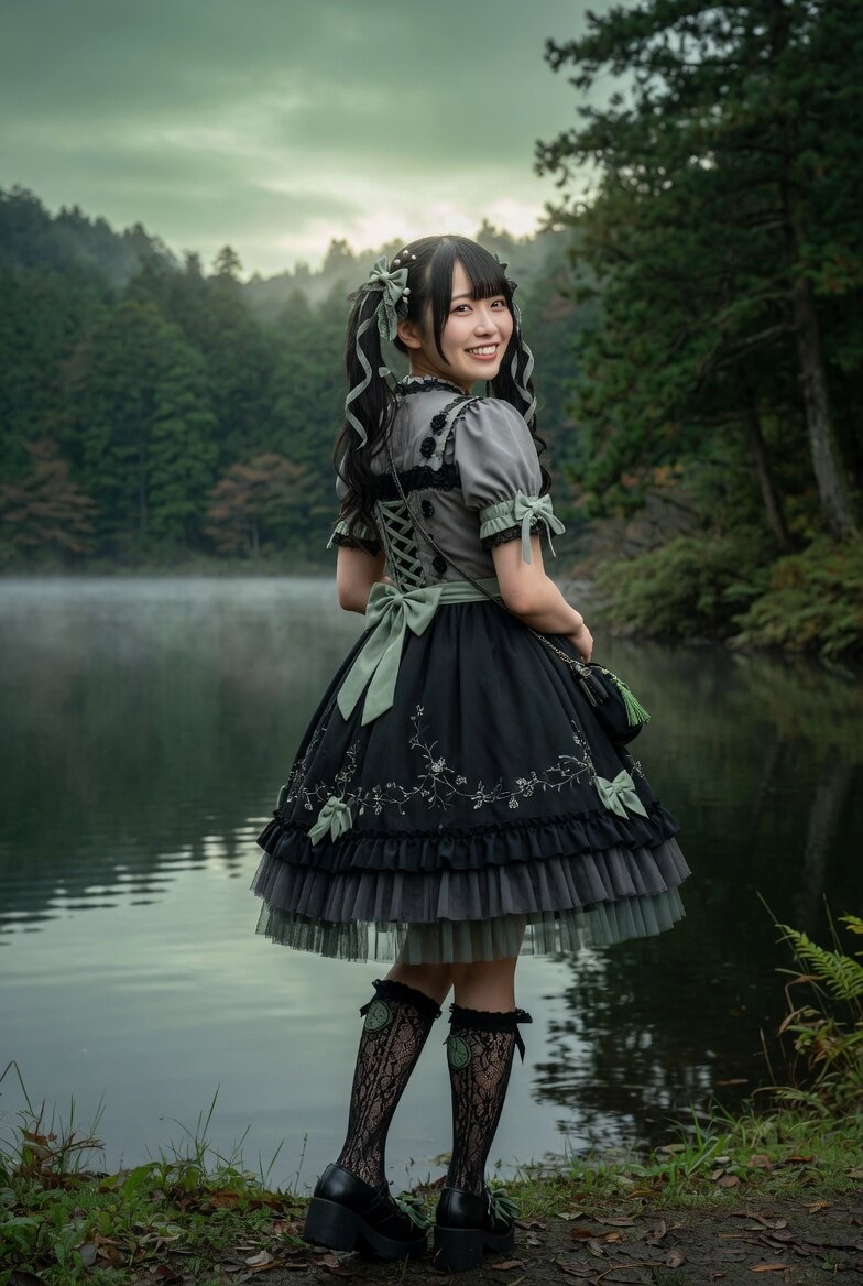 日本人女性23歳のリアルな写真。プロのカメラマンによる撮影。グレーイッシュグリーンをアクセントカラーにしたロリータの衣裳を身につけている。森と湖の前で撮影。表情は笑顔。背中側からの構図。