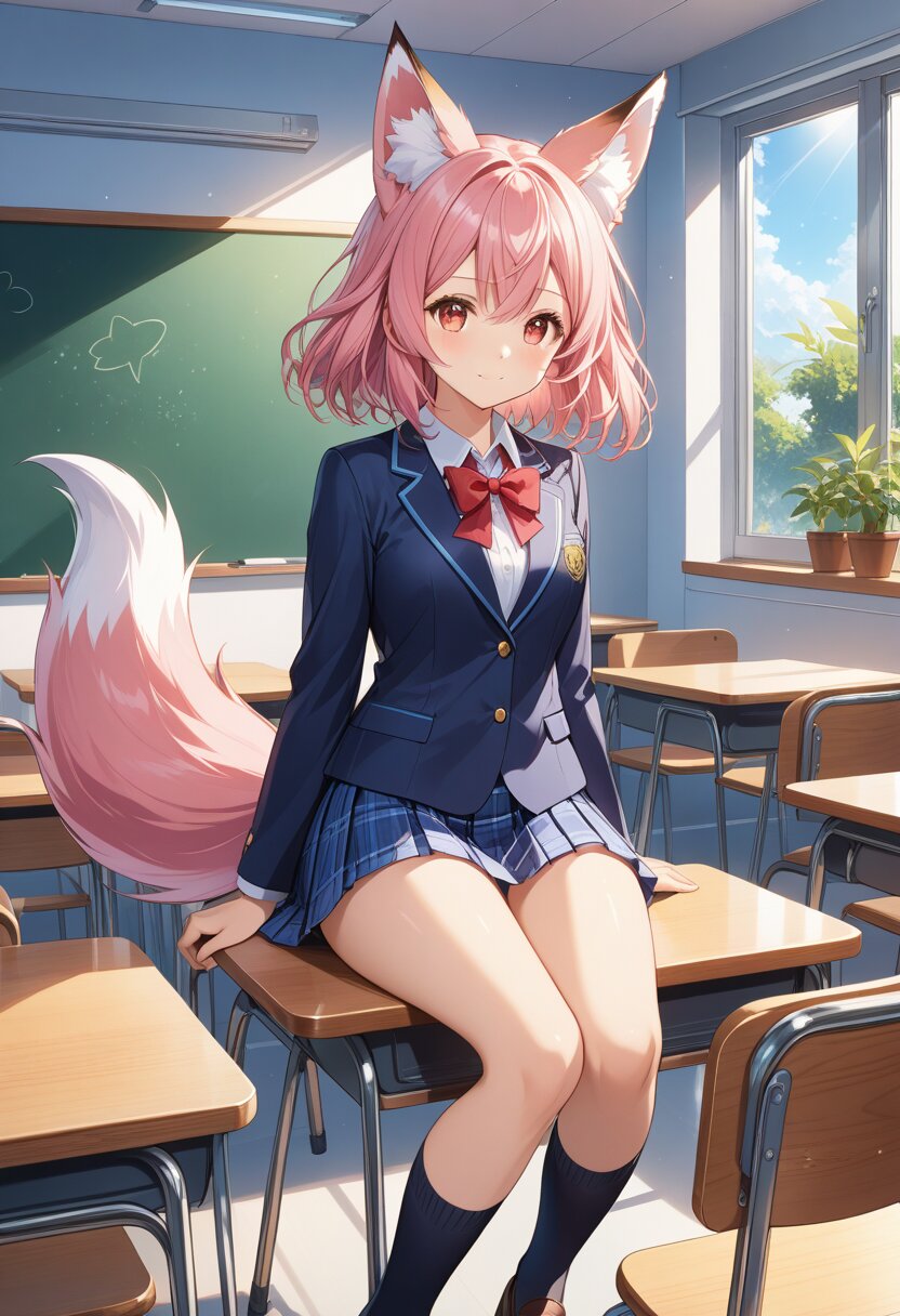 (high resolusion,illustration,ultra detailed 8k art,extremely detailed CG,official art,clothes reflecting light,detailed shiny skin,detailed background:1.3), ((highly detailed beautiful face and eyes),anime‑style, big fox ears, fox‑ears girl, full‑body, cheerful expression, long pink hair, delicate facial features, double‑eyelids, long eyelashes, red eyes, star‑shaped reflections in eyes, strong focus on eyes, fluffy pink fox tail, navy school blazer, red ribbon bow on chest, blue plaid mini skirt, high‑school girl, black socks, brown loafers, single garter on one leg, classroom setting, school‑life atmosphere, desk, chair, blackboard, bright colors, clean lineart, high‑detail illustration
