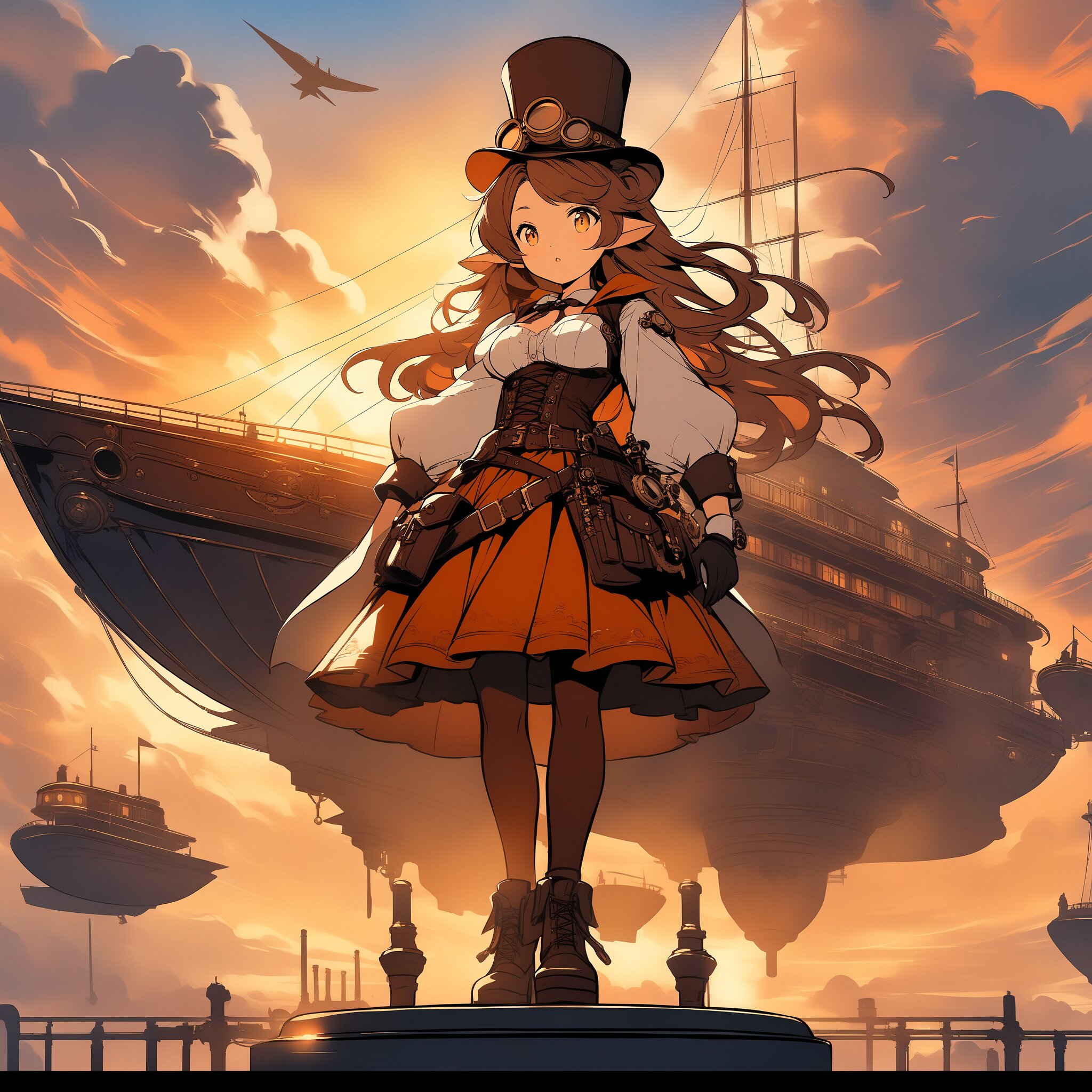 Steampunk fantasy, a cat-eared girl adventurer standing on a floating mechanical platform, goggles on her forehead. Overlooking a sky filled with airships and golden clouds at sunset. Wearing a leather corset, utility belts, and Victorian-style gear. Her fluffy brown ears peeking through a small top hat. Background features massive brass gears and steam pipes venting white smoke. Vibrant amber lighting, epic scale, concept art style, highly detailed, 8k.