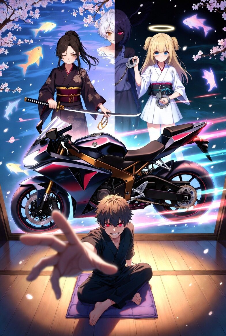 相反する要素が渦巻くこの場所で、二人の女性に見守られ、一人の青年がバイクへと手を伸ばす。