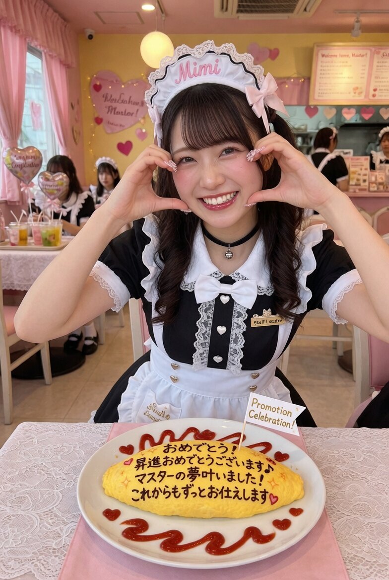 メイド喫茶のメイドである女性のリアルなフォト。昇進を祝したメッセージ入りのオムライスと、ハートハンドのポーズ。お祝いの笑顔。