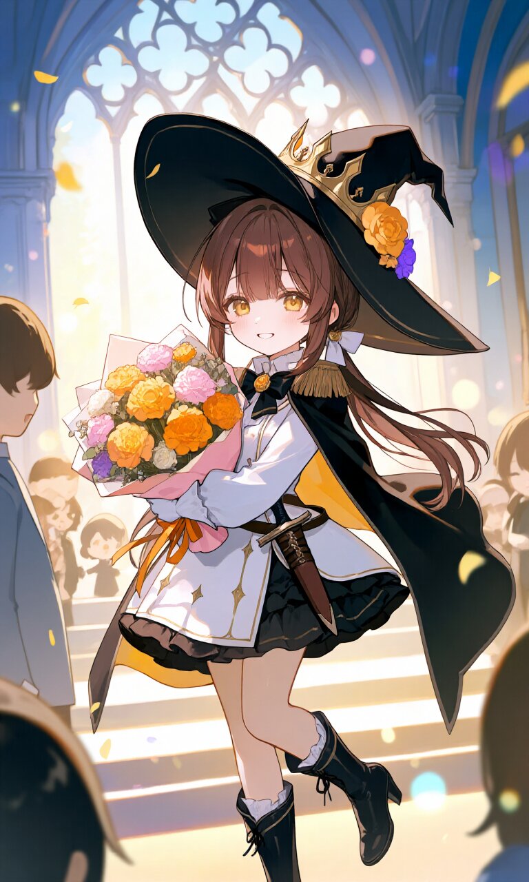 A charming young girl with long brown hair, bangs, and sidelocks stands in a luxurious palace ballroom, wearing a ((black witch hat:1.5)) adorned with a (hat flower:1.8). Her yellow eyes sparkle as she looks at the viewer with a happy, blushing smile and parted lips. She wears a (White luxurious Prince costume:1.5) with long sleeves, a black bowtie, and a (luxurious Black Cape:1.4) flowing behind her. The outfit includes a (luxurious Black mini skirt:1.3) and (Black luxurious Boots:1.3), with a (dagger on waist:1.3) adding a touch of danger. A (luxurious crown:1.3) sits atop her head, and (luxurious White gloves:1.2) complete her regal look. She holds a (bouquet in hand:1.8) of colorful carnations, surrounded by friends in this heartwarming birthday scene. The (Palace:1.2) features (Gothic architecture:1.2) with dreamy, soft lighting, bloom effects, and lens flare abuse creating a romantic academia atmosphere. The style is (chibi, cute) yet insanely detailed, with masterpiece-quality rendering of her face, skin, hair, and clothes.