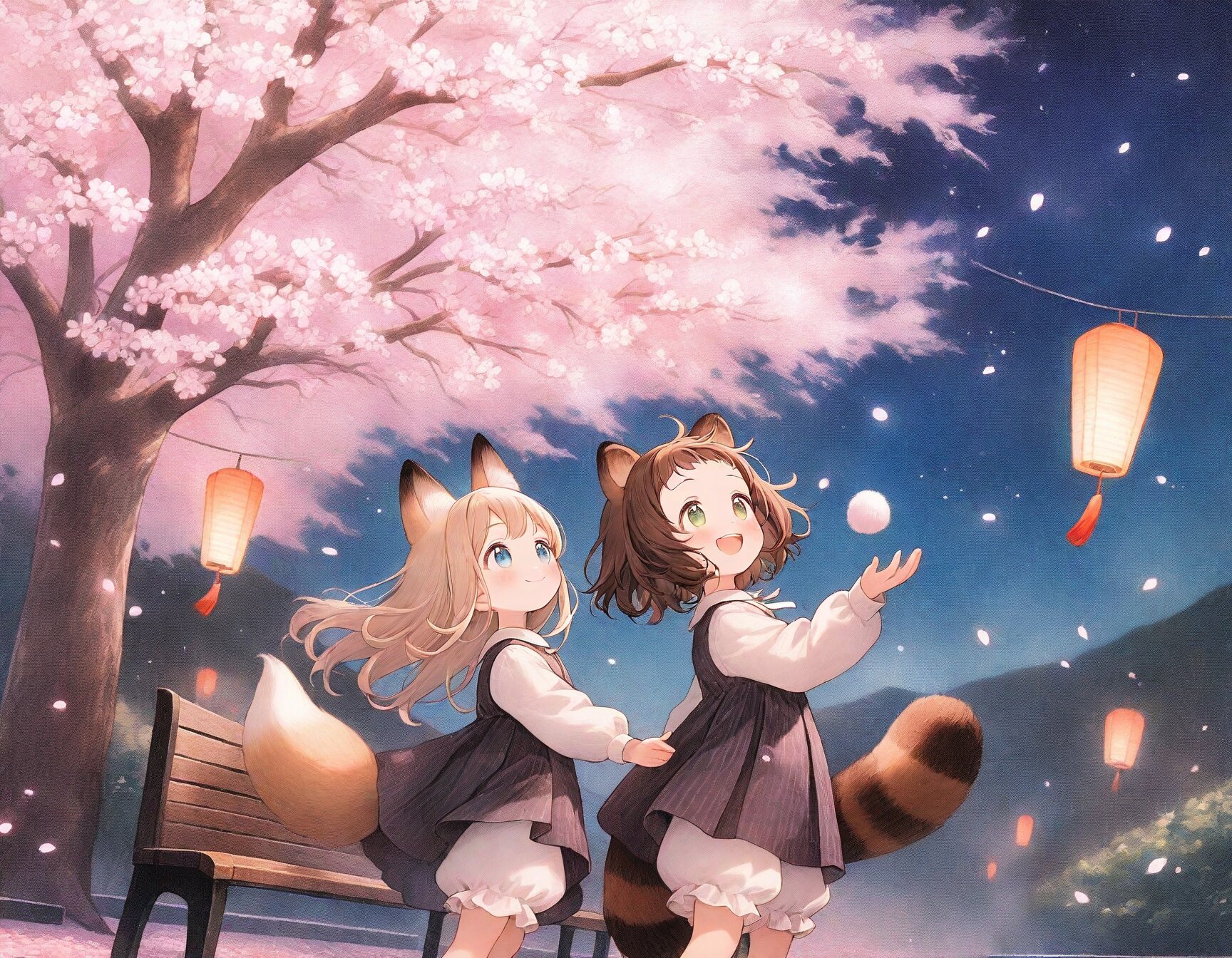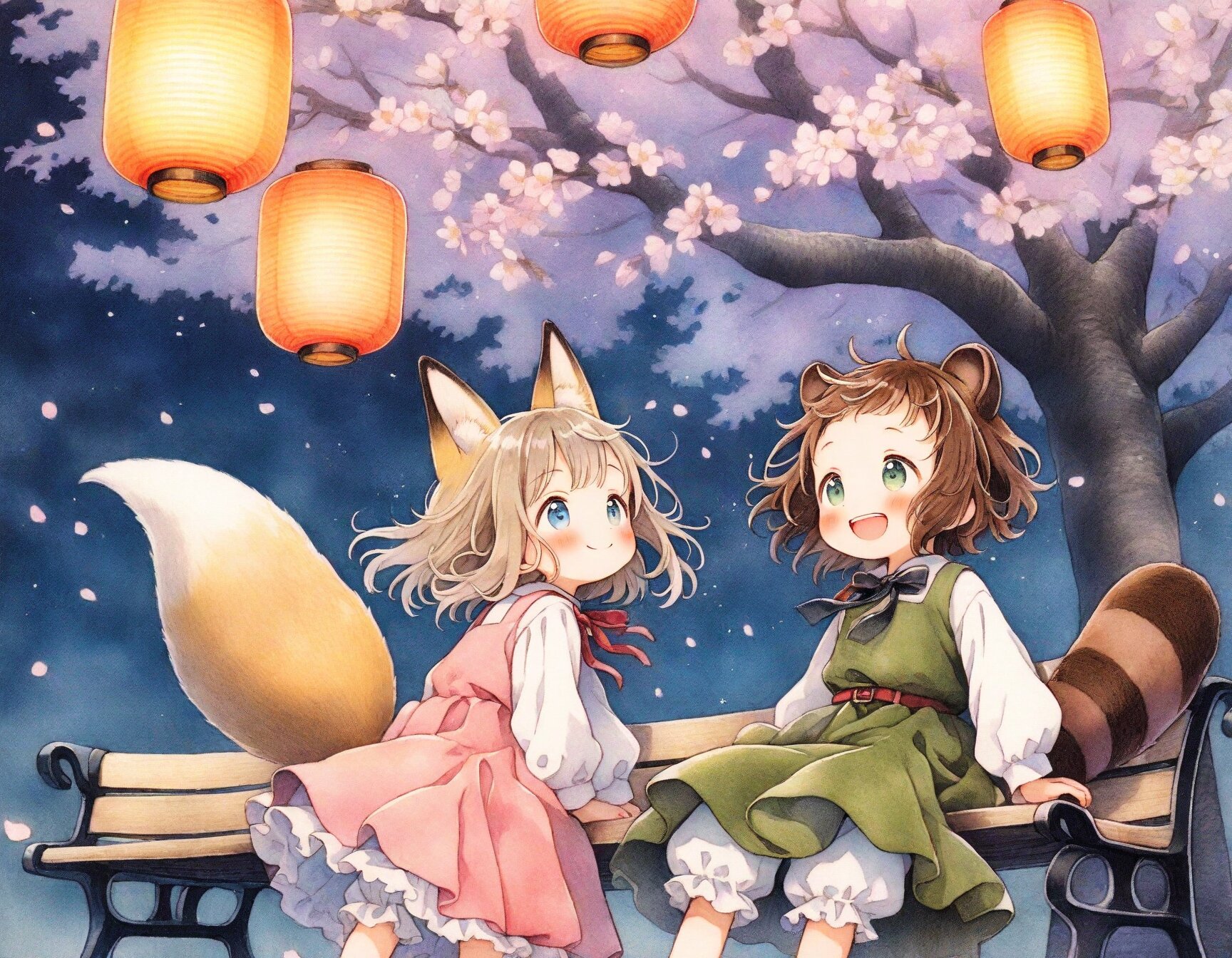 2girls, loli, (masterpiece, best quality:1.2), (soft pastel art style:1.4), (watercolor and colored pencil:1.3), airy, fluffy, dreamy, detailed skin texture, delicate features, (soft shadows:1.3), no outline, (texture of paper:1.1), ethereal, traditional media, deformed, (pastel colors), (fabric texture), (felt texture), (cotton texture), dynamic pose, dynamic angle, from behind , , upper body, night, night sky, cherry blossoms, paper lantern, park bench, side by side, together, looking up, petals, falling petals, fantasy, BREAK loli, light brown hair, medium hair, choppy bangs, blue eyes, (light brown fox ears, Light brown fox tail with white tip, petite), pink pinafore dress, frilled dress, frilled bloomers, happy smile, BREAK loli, dark brown hair, short hair, messy hair, short bangs, green eyes, tareme, (dark brown raccoon ears, dark brown raccoon tail with striped pattern), green pinafore dress, frilled dress, frilled bloomers, happy laughing,