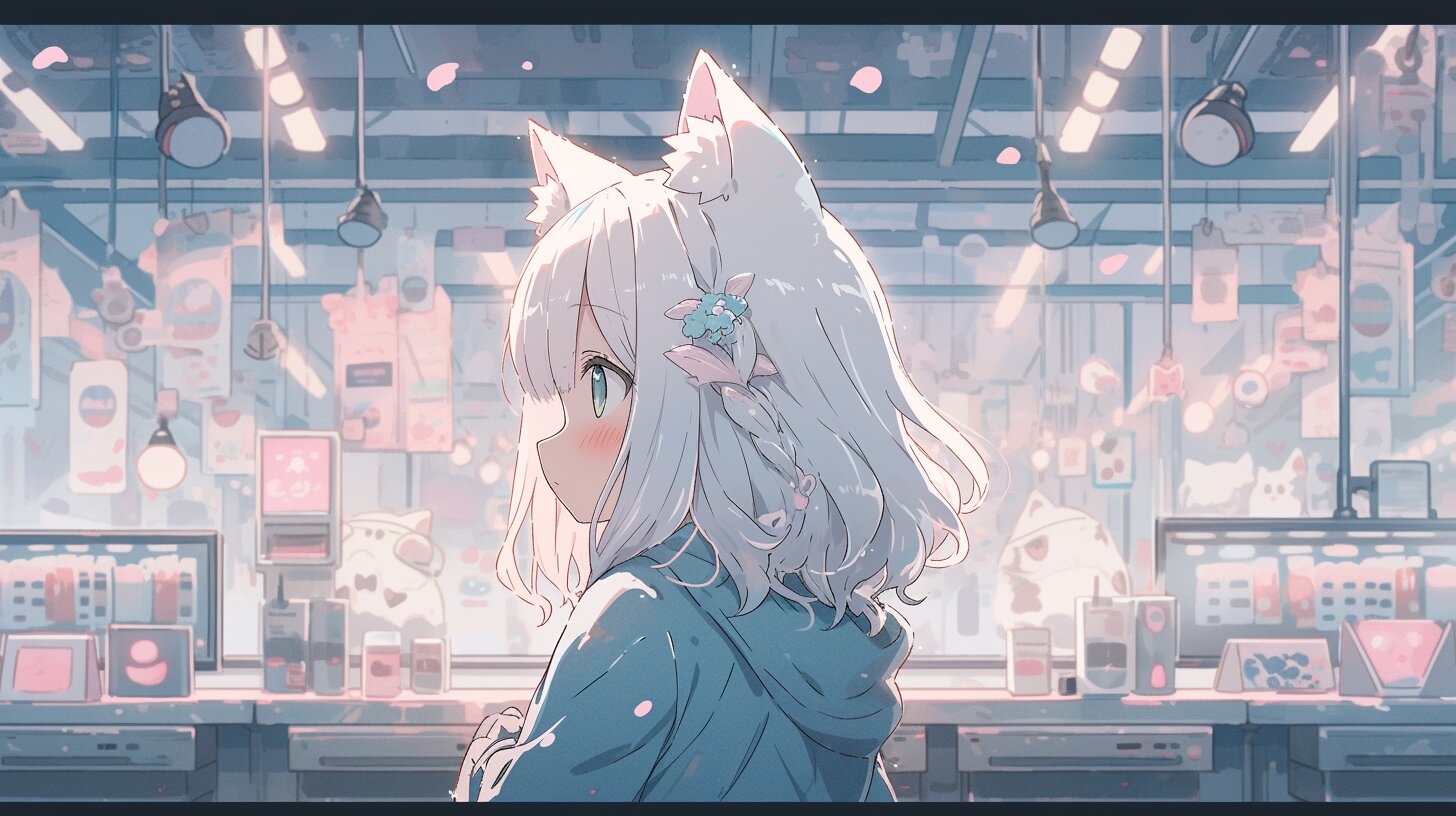 深夜のコンビニで、白髪の猫耳少女が棚の向こうにいる君に気づき、頰を赤らめて振り返る。桜の花びらが舞うような柔らかな照明の下、日常の片隅で始まる小さな冒険。彼女の緑の瞳に映るのは、運命的な一瞬か、それともただの偶然? 君の存在が、彼女の心に優しい波紋を広げていく。そこからどんな物語が紡がれるのだろうか。