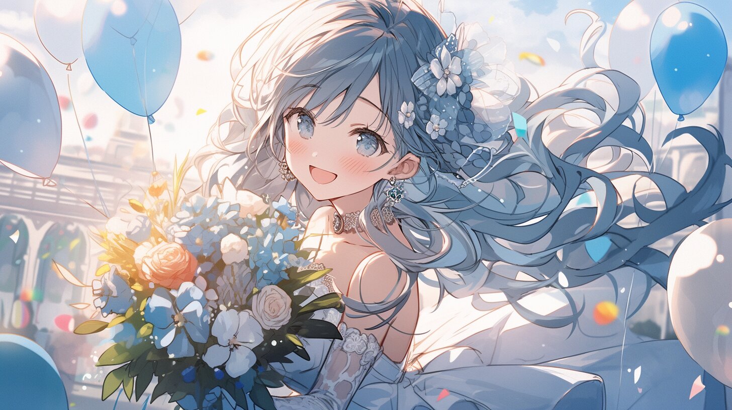 青い髪をなびかせ、白いドレスに身を包んだ少女が、花束を抱えて笑顔を浮かべる。風船が空に舞う街の祭りで、彼女は運命の相手と出会ったばかり。花の香りと陽光に包まれ、永遠の約束を交わす瞬間。風が運ぶ風船のように、未来への希望が膨らむ。彼女の冒険はここから始まるのか、それともこれは夢の続き? 想像を掻き立てる、幸せの予感に満ちた一幕。
