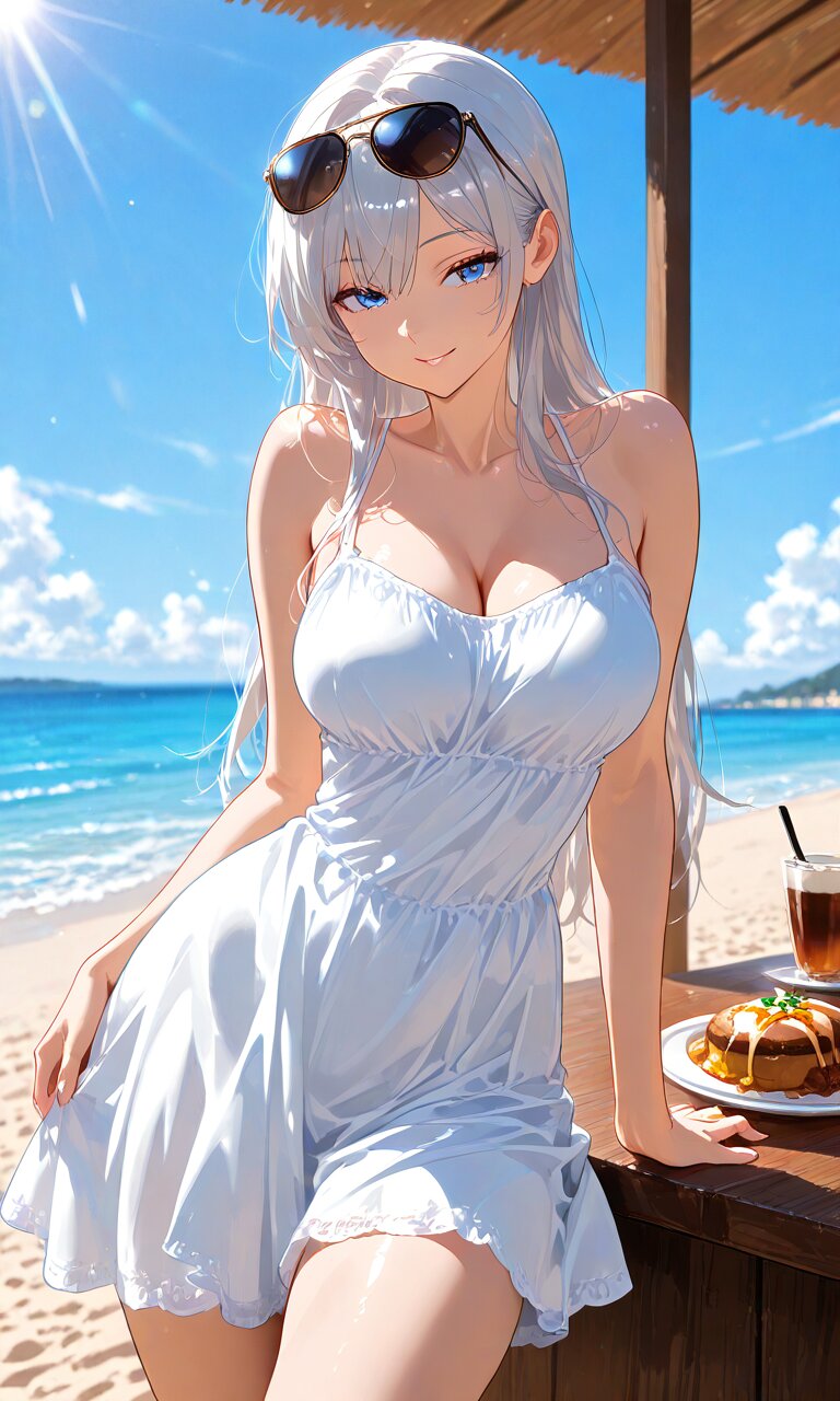 (best quality),(masterpiece),(ultra detailed),1 lady, long hair, silver hair, blue eyes, seductive smile, big breasts, cowboy shot, sunglasses, cafe, breakfast, beach