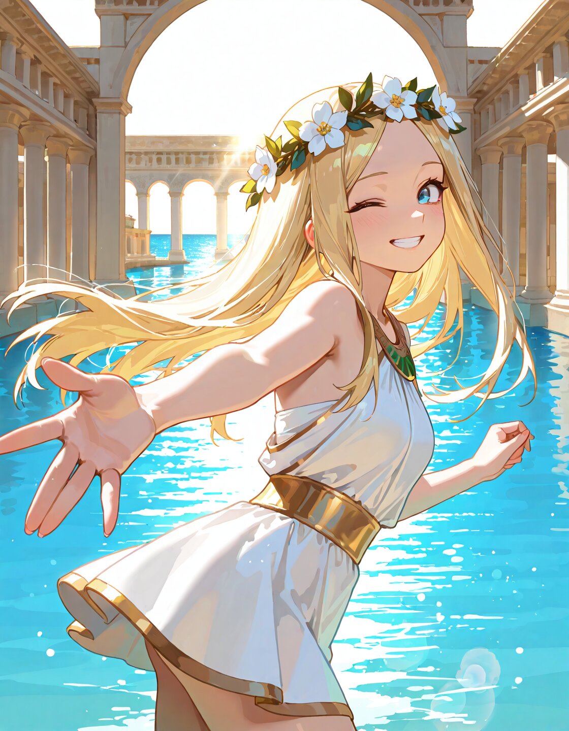 solo,long hair,straight hair,forehead,center parted bangs,hair ornament,blonde hair,delicate face,detailed face,detailed skin,masterpiece,best quality,insanely detailed,beautiful,16k,photorealistic, cute face,happy,cheerful,grin,one eye closed,looking at viewer,(reaching at viewer:1.2),outstretched arm, (olive wreath with some white flowers:1.3),(wearing a greek mythology white costume with gold trim:1.5),(mini skirt:1.4), (ancient Greece:1.5),ocean,sapphire sea, intense deep‑blue water, bright sunlight gleams, high clarity,in the morning,windy,chill atmosphere,classic academia,(Mediterranean architecture:1.4),(reflective atmosphere:1.2), (in the style of luminosity of water:1.3), shining lights,(lens flare),sunlight,sunbeam,warm lighting,side view,wide view,cowboy shot,