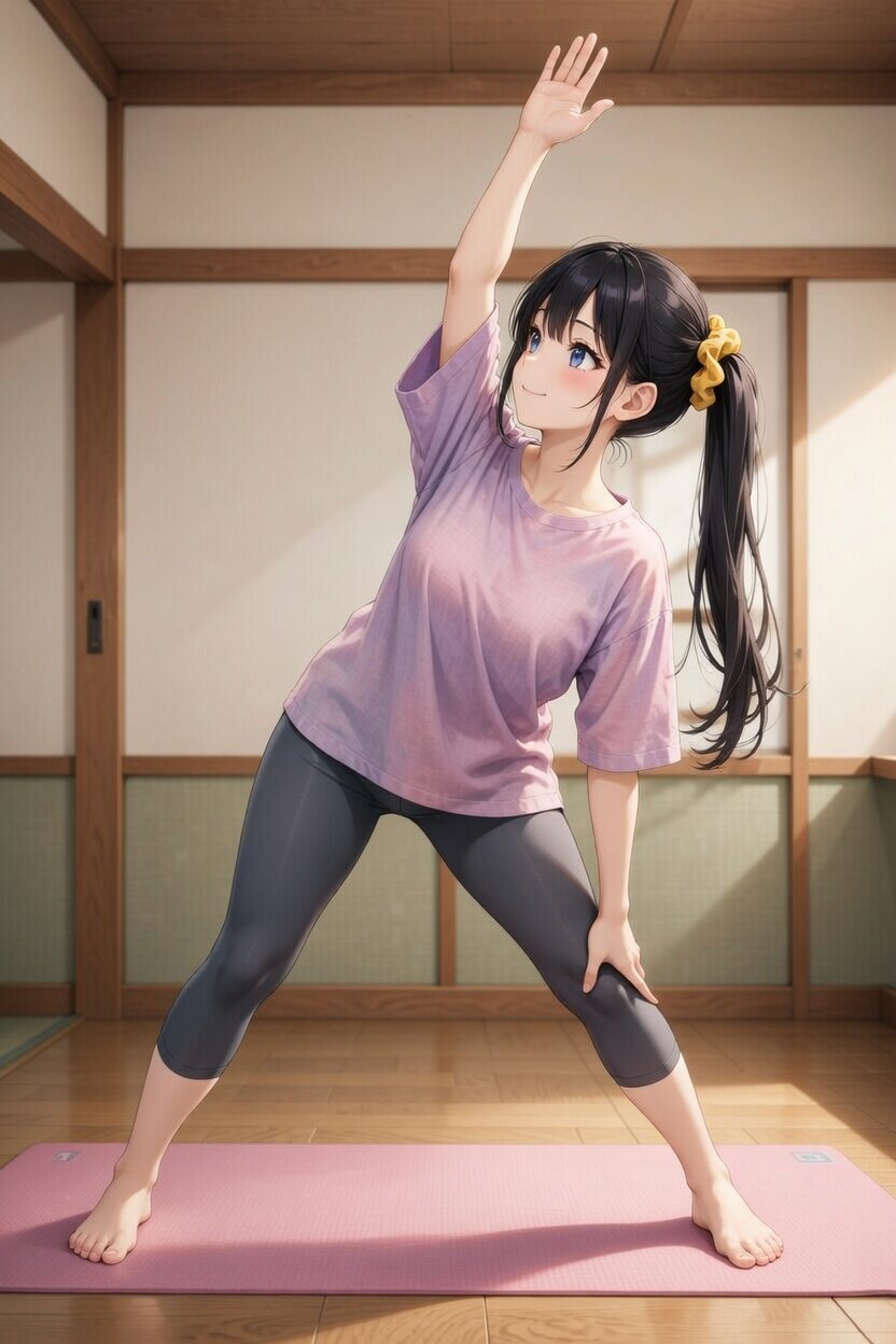 ポニーテール、黄色のシュシュ。優しい笑顔、穏やかな表情、ヨガの三角のポーズ(Utthita Trikonasana / Extended Triangle Pose)、右側に体を倒したバージョン、右手で左足首を掴む、左手は天井に向かって真っ直ぐ伸ばす、視線は上に向ける、室内の明るいナチュラル光、シンプルで清潔な和風モダンな部屋、木の床、薄いピンクのヨガマット、ゆったりしたゆったりした麻調の薄紫ピンクのオーバーサイズTシャツ、ダークグレーの7分丈レギンス、素足、ナチュラルメイク、リラックスした雰囲気、高解像度、柔らかい自然光、詳細な肌の質感。