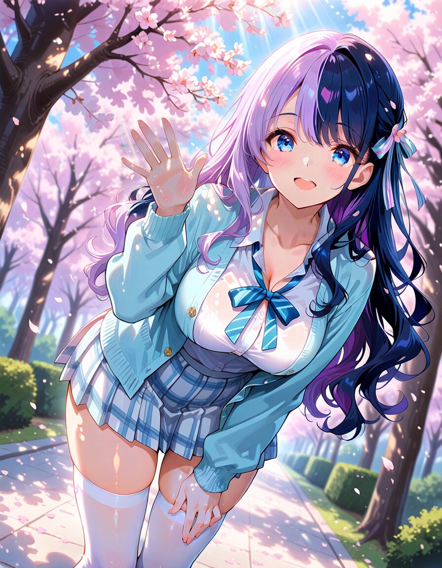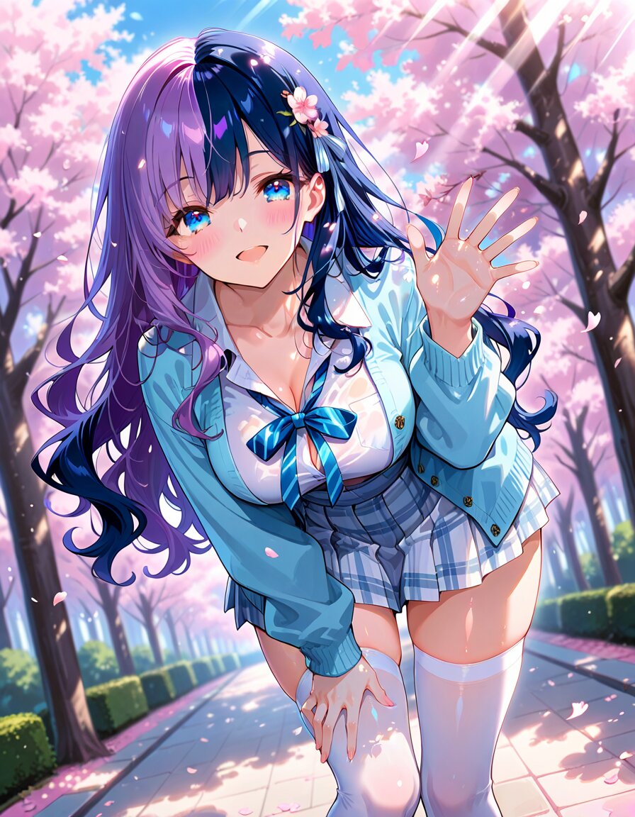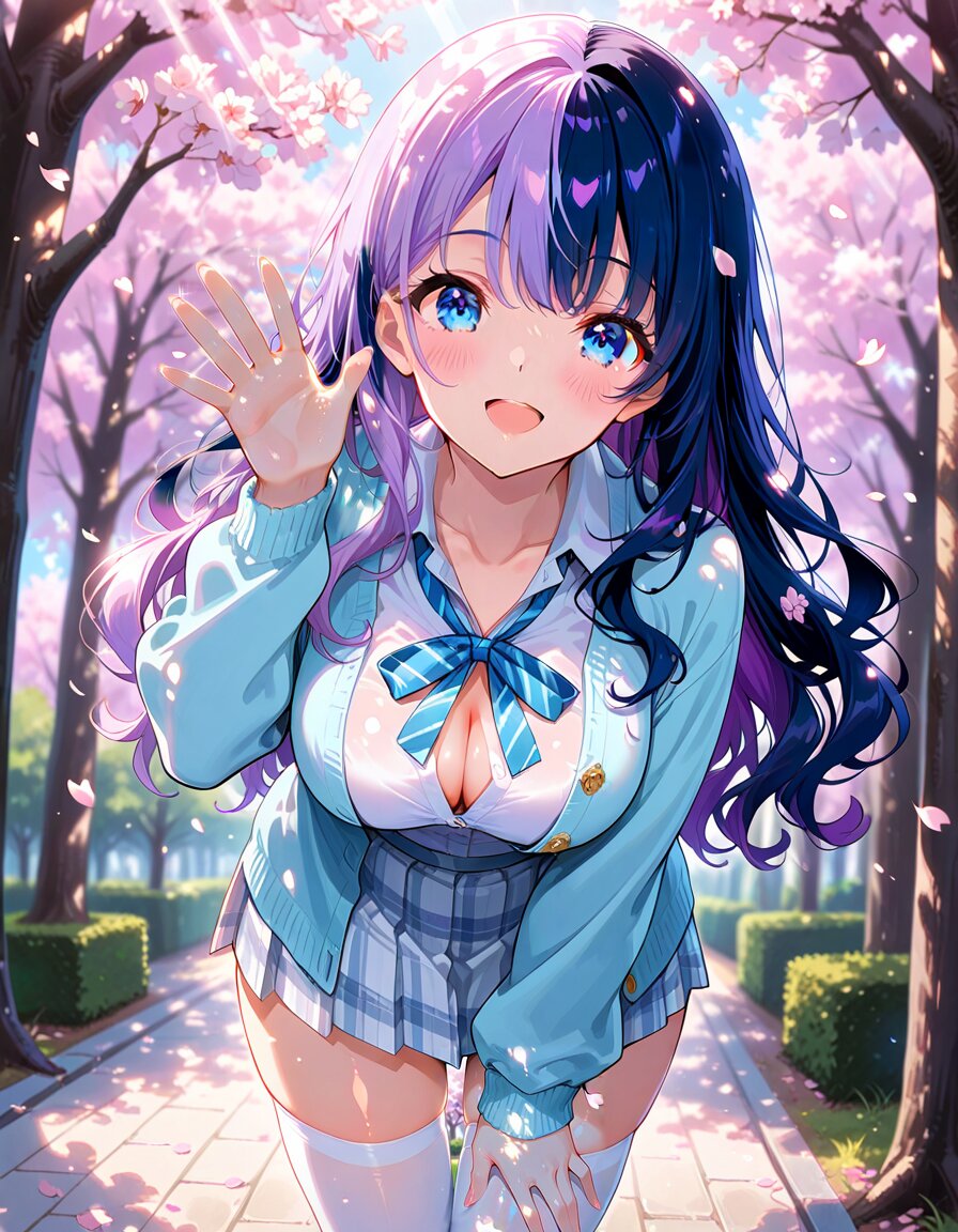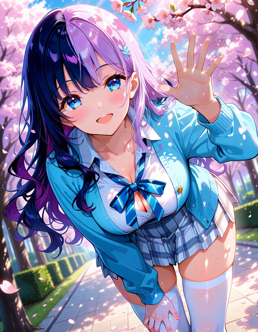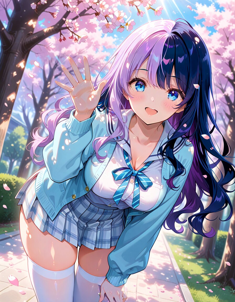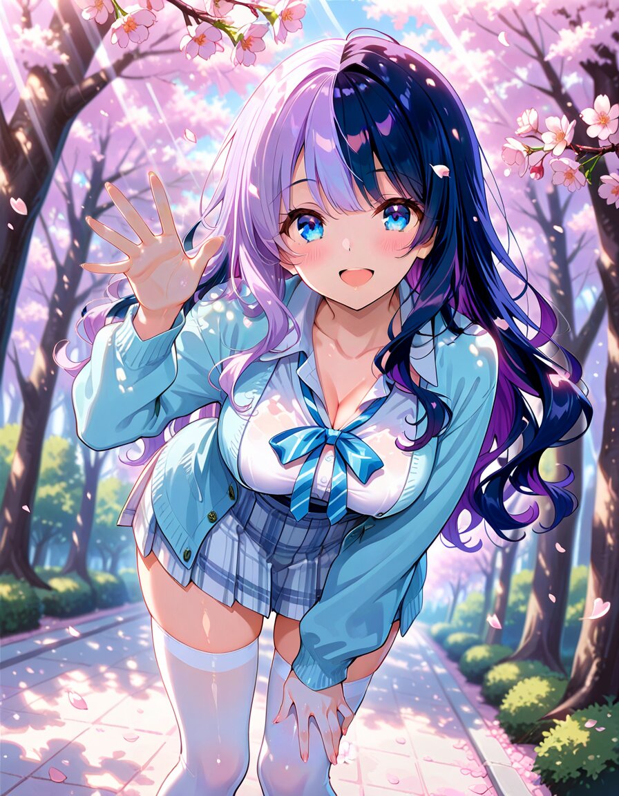 1girl, solo, looking at viewer, (dynamic pose:1.2), dynamic angle, (leaning forward:1.25), (waving, hand up:1.1), (hand behind back:1.1), cherry blossoms, cherry blossom tree, falling petals, outdoors, day, spring, sunlight, dappled sunlight, sunbeam, depth of field, blurry background, (rim lighting:1.15), backlighting, cinematic lighting, highly detailed background, BREAK ((split-color hair:1.3), ((purple hair:1.2), (dark blue hair:1.2)):1.3), (two-tone hair:1.2), (long hair:1.2), (long wavy hair:1.3), bangs, (white hair:-1), (pink hair:-1), (blue eyes:1.2), japanese_girl, (medium breasts:1.3), (curvy:1.3), cleavage, collarbone, (voluptuous:1.2), (shiny skin, gleaming skin:1.4), smile, open mouth, blush, BREAK (school uniform:1.3), (light blue open cardigan:1.2), collared shirt, (see-through white shirt:0.4), (light blue ribbon, striped ribbon, neck ribbon:1.1), (white skirt, plaid skirt, pleated skirt:1.2), (thighhighs, white thighhighs, zettai ryouiki:1.2), ((8k, masterpiece ,best quality ,ultra-detailed)), game cg, masterpiece, year 2025, newest, (perfect face:1.1025), (perfect hands:1.1025), (perfect legs:1.1025), (perfect arms:1.1025), (perfect fingers:1.1025), <lora:xl_more_art-full_v1:0.6> <lora:add-detail-xl:1> <lora:Fixhands_anime_bdsqlsz_V1:1>