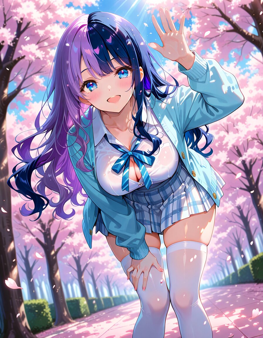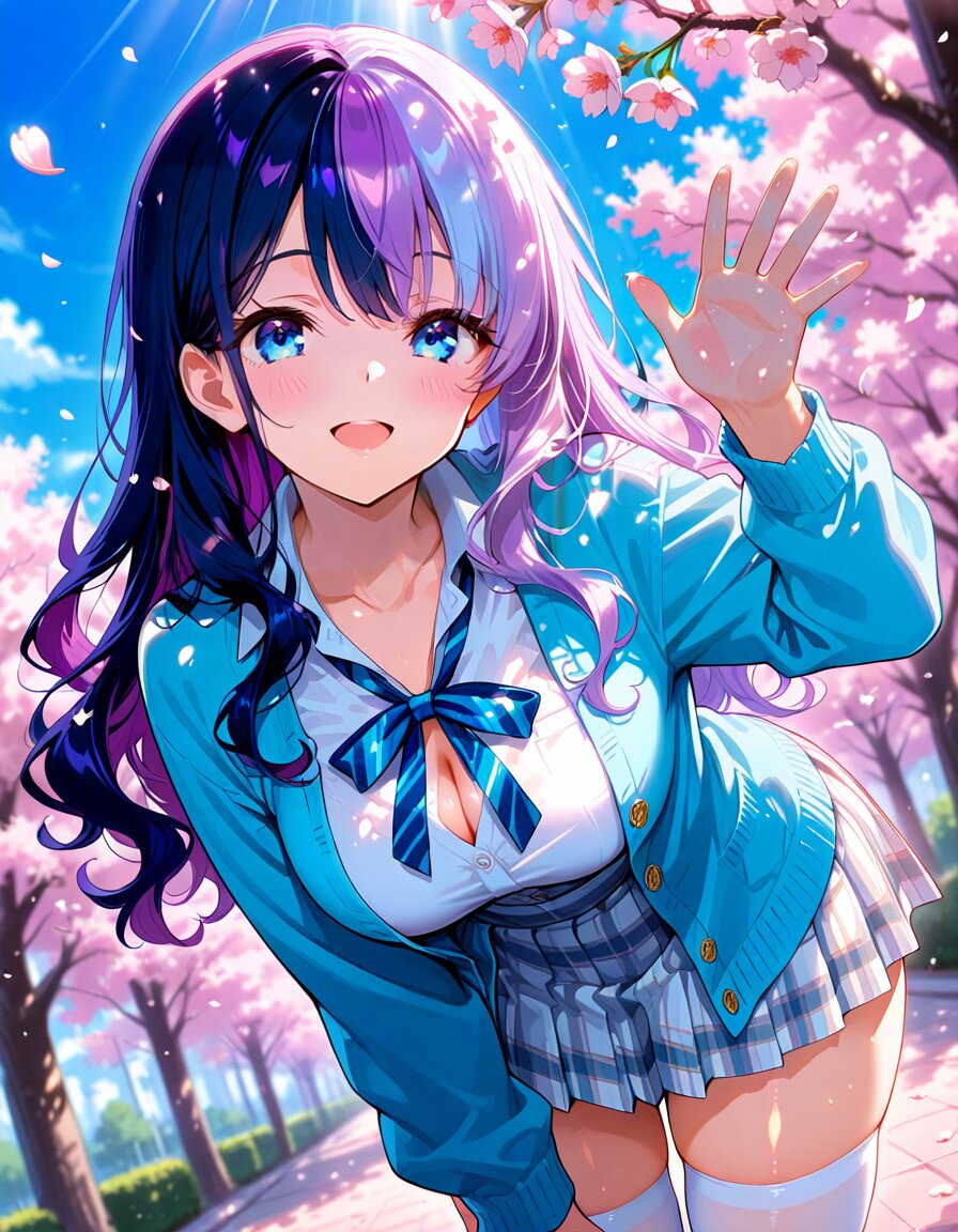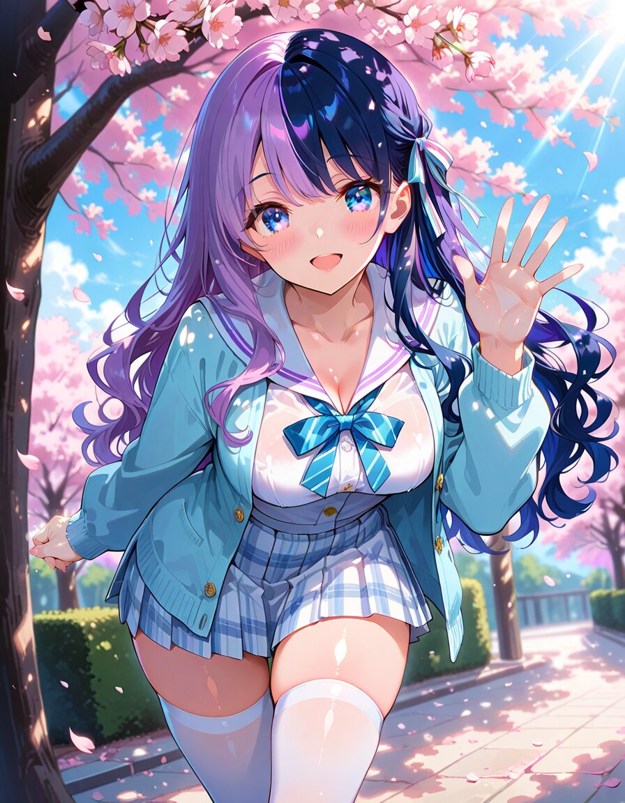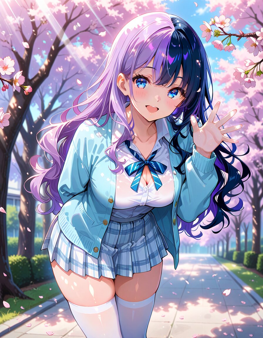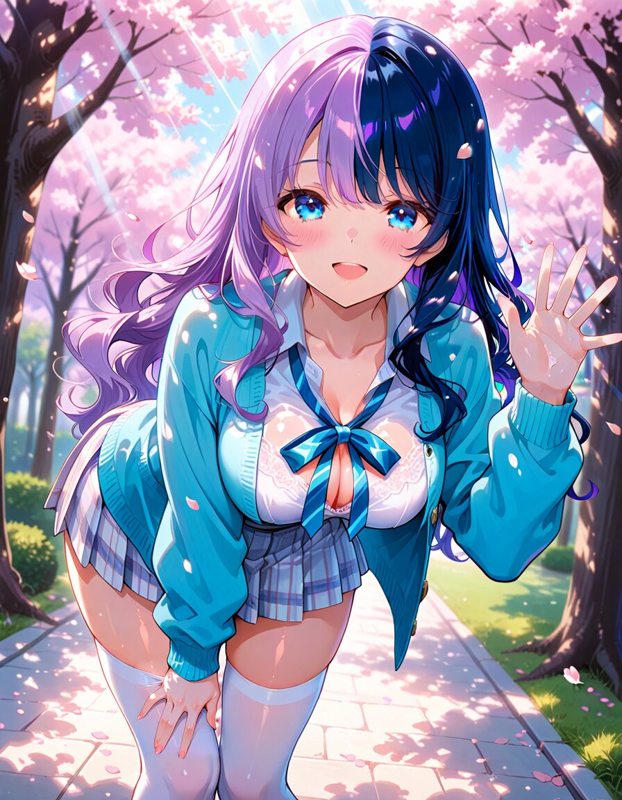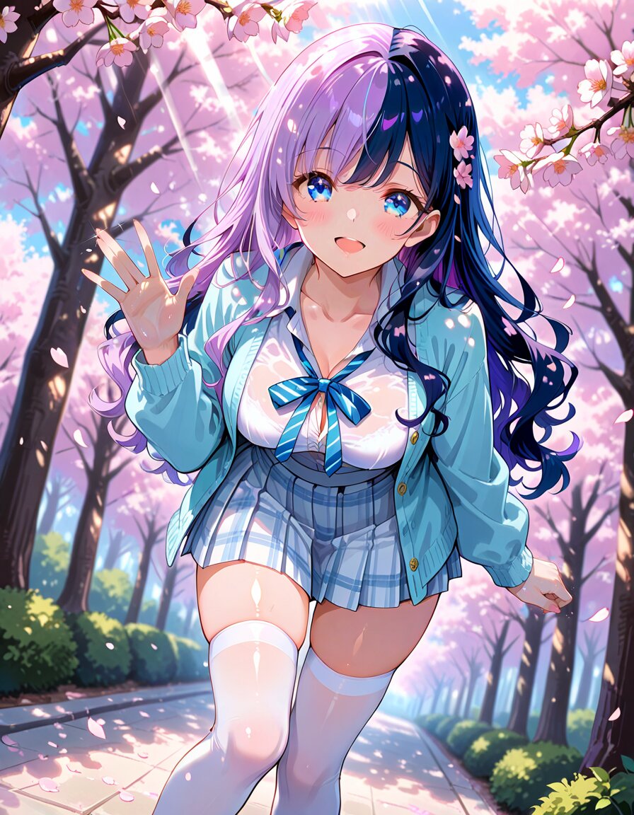 1girl, solo, looking at viewer, (dynamic pose:1.2), dynamic angle, (leaning forward:1.25), (waving, hand up:1.1), (hand behind back:1.1), cherry blossoms, cherry blossom tree, falling petals, outdoors, day, spring, sunlight, dappled sunlight, sunbeam, depth of field, blurry background, (rim lighting:1.15), backlighting, cinematic lighting, highly detailed background, BREAK ((split-color hair:1.3), ((purple hair:1.2), (dark blue hair:1.2)):1.3), (two-tone hair:1.2), (long hair:1.2), (long wavy hair:1.3), bangs, (white hair:-1), (pink hair:-1), (blue eyes:1.2), japanese_girl, (medium breasts:1.3), (curvy:1.3), cleavage, collarbone, (voluptuous:1.2), (shiny skin, gleaming skin:1.4), smile, open mouth, blush, BREAK (school uniform:1.3), (light blue open cardigan:1.2), collared shirt, (see-through white shirt:0.4), (light blue ribbon, striped ribbon, neck ribbon:1.1), (white skirt, plaid skirt, pleated skirt:1.2), (thighhighs, white thighhighs, zettai ryouiki:1.2), ((8k, masterpiece ,best quality ,ultra-detailed)), game cg, masterpiece, year 2025, newest, (perfect face:1.1025), (perfect hands:1.1025), (perfect legs:1.1025), (perfect arms:1.1025), (perfect fingers:1.1025), <lora:xl_more_art-full_v1:0.6> <lora:add-detail-xl:1> <lora:Fixhands_anime_bdsqlsz_V1:1>
