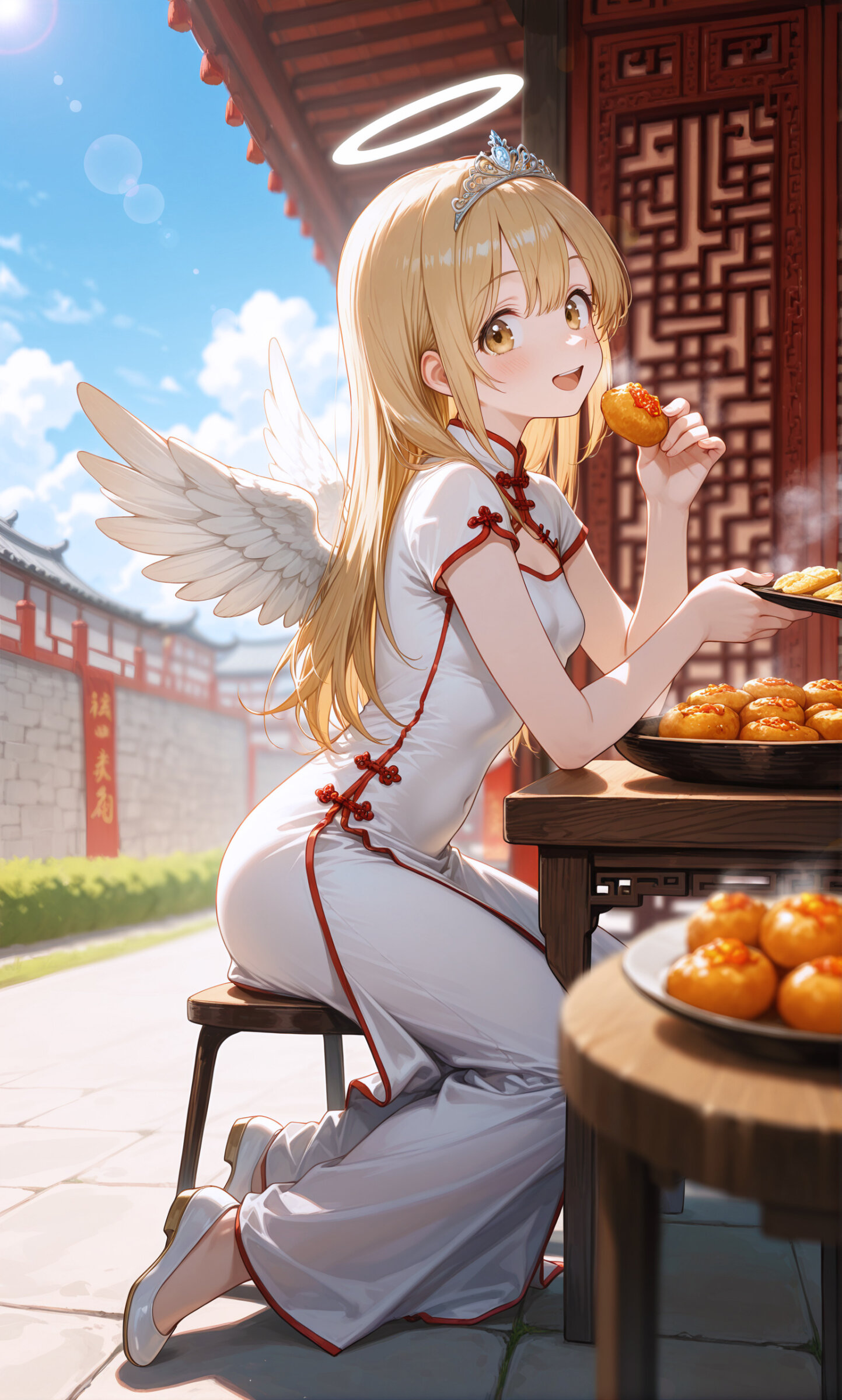 masterpiece, best quality, absurdres, 8k, ultra detailed, aesthetic, very aesthetic, newest, BREAK (shallow depth of field,Gaussian Blur,lens flare:1.6),outdoor dining, table full of food,sharing meal, enjoying food,(great wall of china in background:1.3),traditional chinese atmosphere,red decorations, elegant setting,sitting at table, about to eat, lively expression,bright daylight, blue sky, soft clouds,warm sunlight, vibrant colors,steam rising from food,food steam, delicious atmosphere,(blonde hair, long hair, brown eyes, smile,tareme,open mouth,white angel wings,tiara,halo:1.1),wearing a china dress,onepiece,short sleeves,curvy,small breasts,elegant pose,looking at viewer, (fullbody shot,side view:1.2),<lora:USNR STYLE_XL_loha:0.5><lora:flat_sdxl:-1.3>