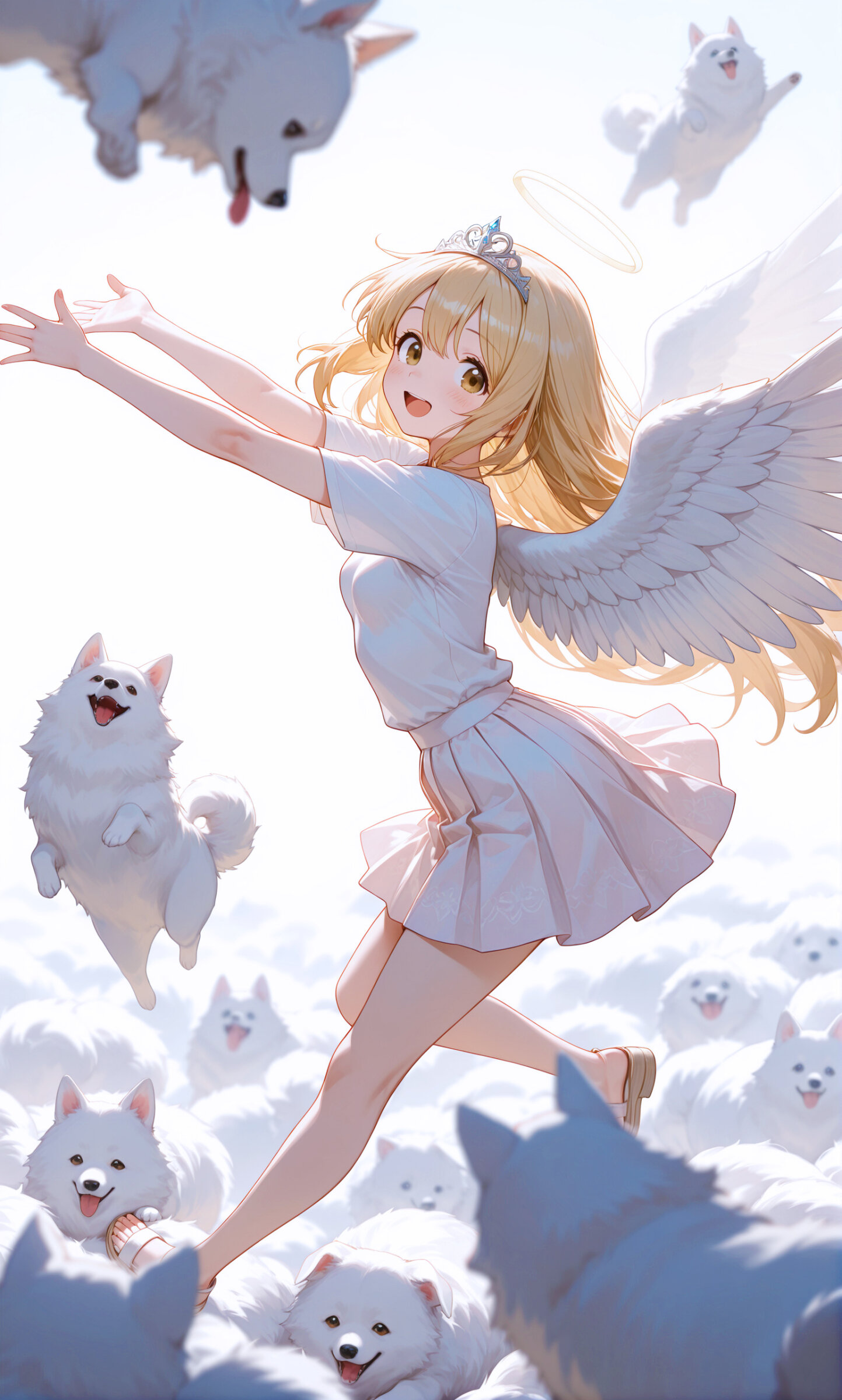 (white theme:1.3),masterpiece, best quality, absurdres, 8k, ultra detailed, aesthetic, very aesthetic, newest, BREAK (shallow depth of field,Gaussian Blur:1.3),(a chaotic pile of fluffy dogs tumbling over each other, playful motion, soft fur bouncing, dynamic composition, extremely dense fluff texture, joyful and energetic scene:1.25),BREAK (blonde hair, long hair, brown eyes, smile,tareme,open mouth,white angel wings,tiara,halo:1.1),casual clothes,t-shirt,light pink pleated skirt,short sleeves,curvy,small breasts,looking at viewer, (fullbody shot,side view:1.2),<lora:USNR STYLE_XL_loha:0.5><lora:flat_sdxl:-1.2>