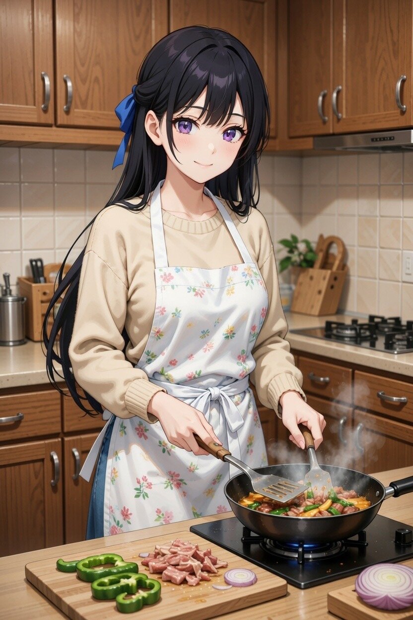 日本人女性24歳のデジタルイラスト。自宅のキッチンで夕食作り。青椒肉絲を1人分作っている。カジュアルな服装をして、エプロンをつけている。