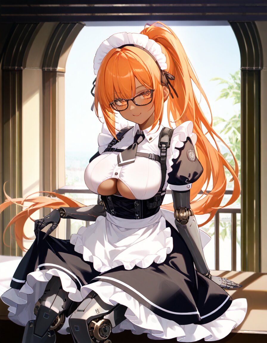 masterpiece, best quality, amazing quality, very aesthetic, high resolution, ultra-detailed, absurdres, newest, scenery, 1girl, solo, (dark skin:1.2), orange hair, ponytail, orange eye, naughty face, large breasts, black-framed eyewear, tactical maid, french maid, maid, maid headdress, white shirt, framed breasts, black puffy sleeves, black skirt, white waist apron, frilled apron, black short necktie, (underboob:0.3), (underboob cutout:0.3), mechanical arms, doll joints, mechanical legs, mechabare, <lora:karen_Pony:0.8>, karen