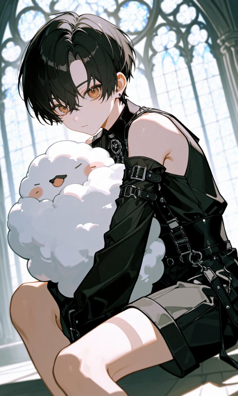 A breathtakingly beautiful young man, a 19-year-old Japanese boy with an innocent expression; his soft black hair falls to the sides, revealing his forehead, and his pale, almost luminous skin reacts strongly to the light. His warm brown eyes possess a quiet depth that draws you in—irises that are impossible to look away from. He is hugging a cute, fluffy white cloud-like creature in his arms. He wears a black bustier-style top with exposed shoulders and a low neckline, paired with long sleeves featuring a unique design adorned with numerous harnesses on the arms. He also wears overalls integrated with shorts, characterized by distinctive shoulder straps. The overall look gives off a dark, gothic impression. The fabric has a matte texture, accented by metal buckles. Against a backdrop of bright white stained-glass Gothic architecture, anime-style illustrations, Gothic fashion, minimalism. Sitting on the floor, cherishing the fluffy creature.
