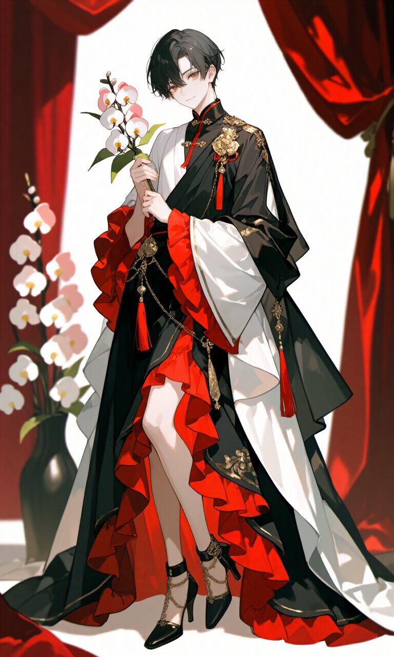 ((masterpiece. High quality)). A breathtakingly beautiful young man, a 19-year-old Japanese boy with an innocent expression; his soft black hair falls to the side, revealing his forehead, and his pale, almost luminous skin reacts vividly to the light. His warm brown eyes possess a quiet depth that draws you in; his irises. A gentle smile. He is wearing a luxurious cheongsam in shades of black and red. The dress features an asymmetrical design with one shoulder exposed, and the white fabric is adorned with delicate gold embroidery. The black fabric is lavishly embellished with vibrant red ruffles, gold accents, tassels, and chains, creating an air of luxury and allure. The sleeves are loose bell sleeves with decorative details. Her high heels feature gold embellishments and chains that match the dress. The hem of the dress is long, forming an elegant train. In her hands, she holds white and pink orchids. The background consists of velvet curtains with red drapes. As a decorative element, a vase of white and pink orchids is placed on the left side. Digital painting, fantasy illustration, Gothic Romanticism, Oriental style Soft, even studio lighting. The details of the dress are rendered with clarity. A full-body shot. The camera captures the scene from a slightly low angle directly in front of the subject. The flared hem and sleeves of the dress extend across the bottom and sides of the frame, emphasizing elegance and grandeur. The orchids are positioned on the left, adding depth and color to the composition. The depth of field is shallow, with the background blurred to keep the subject in sharp focus.