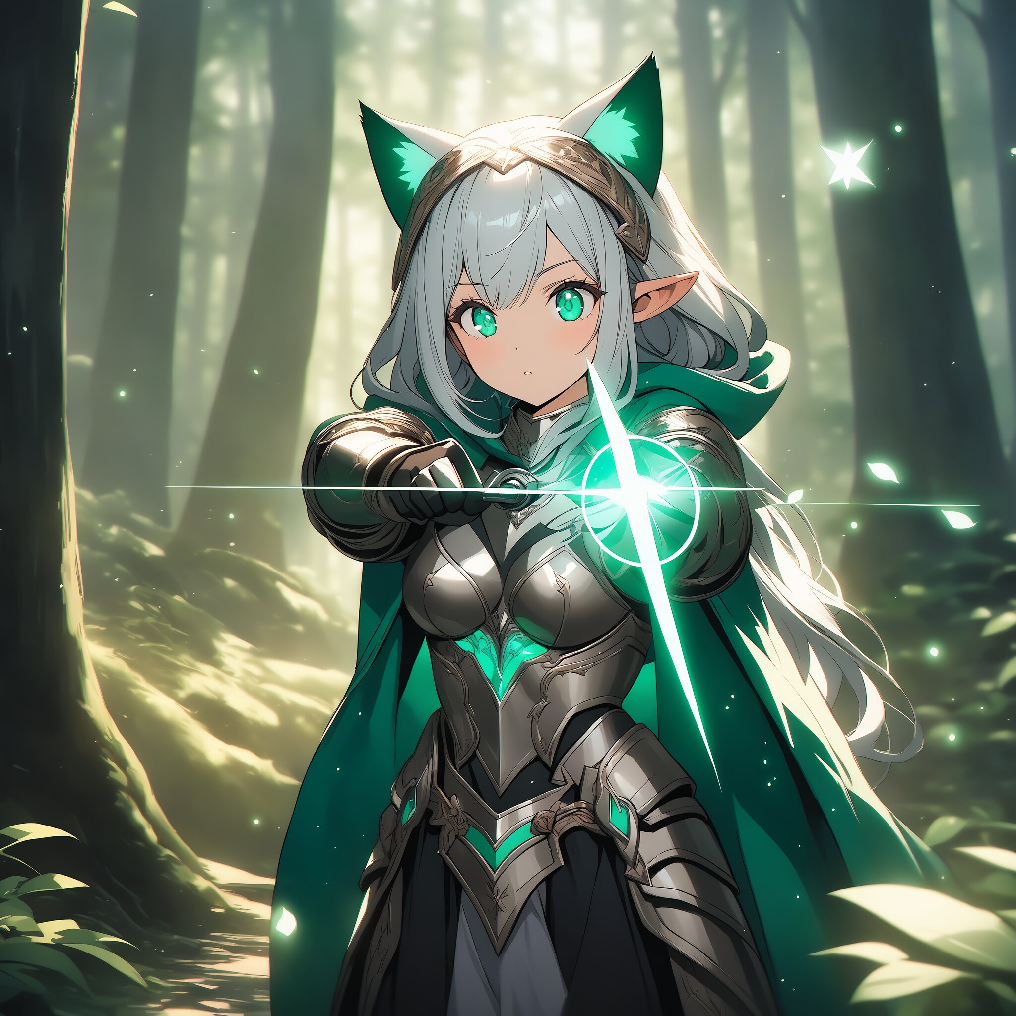 Masterpiece, fantasy art style, a beautiful cat-eared girl archer drawing back a glowing magical bow, aiming at a target with a sharp and focused gaze. She is standing in an ancient forest with dappled sunlight. Her fluffy ears are twitching, long silver hair flowing. Wearing intricate leather armor and an emerald green cloak. Glowing arrow of light, magical particles in the air, cinematic lighting, lush forest background, highly detailed, 8k, sharp focus on her eyes.